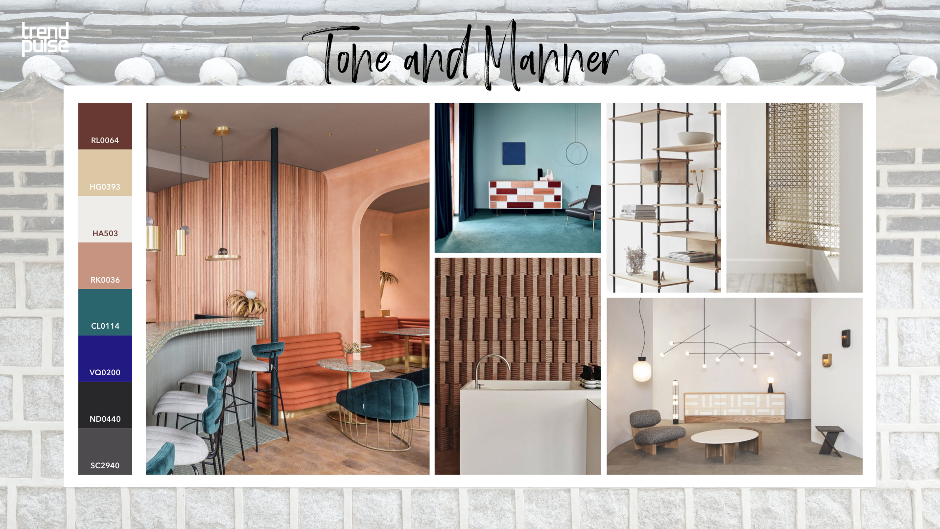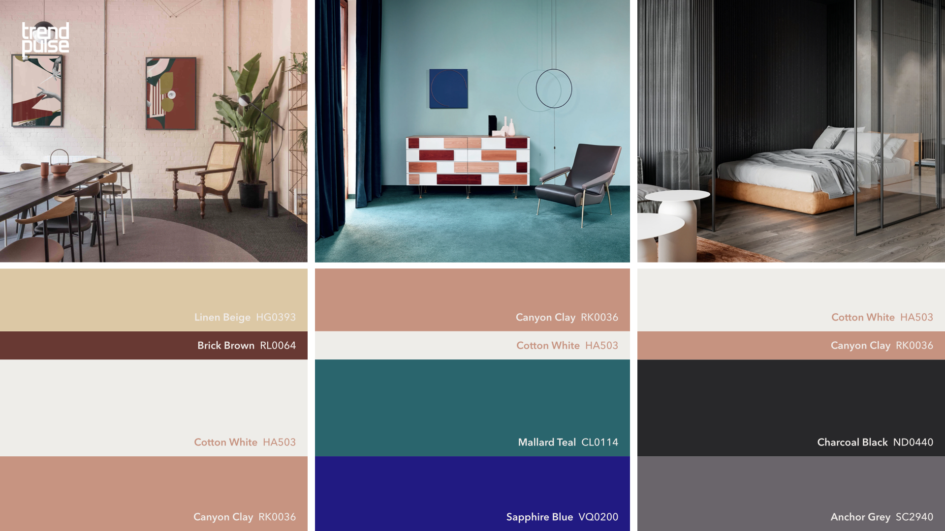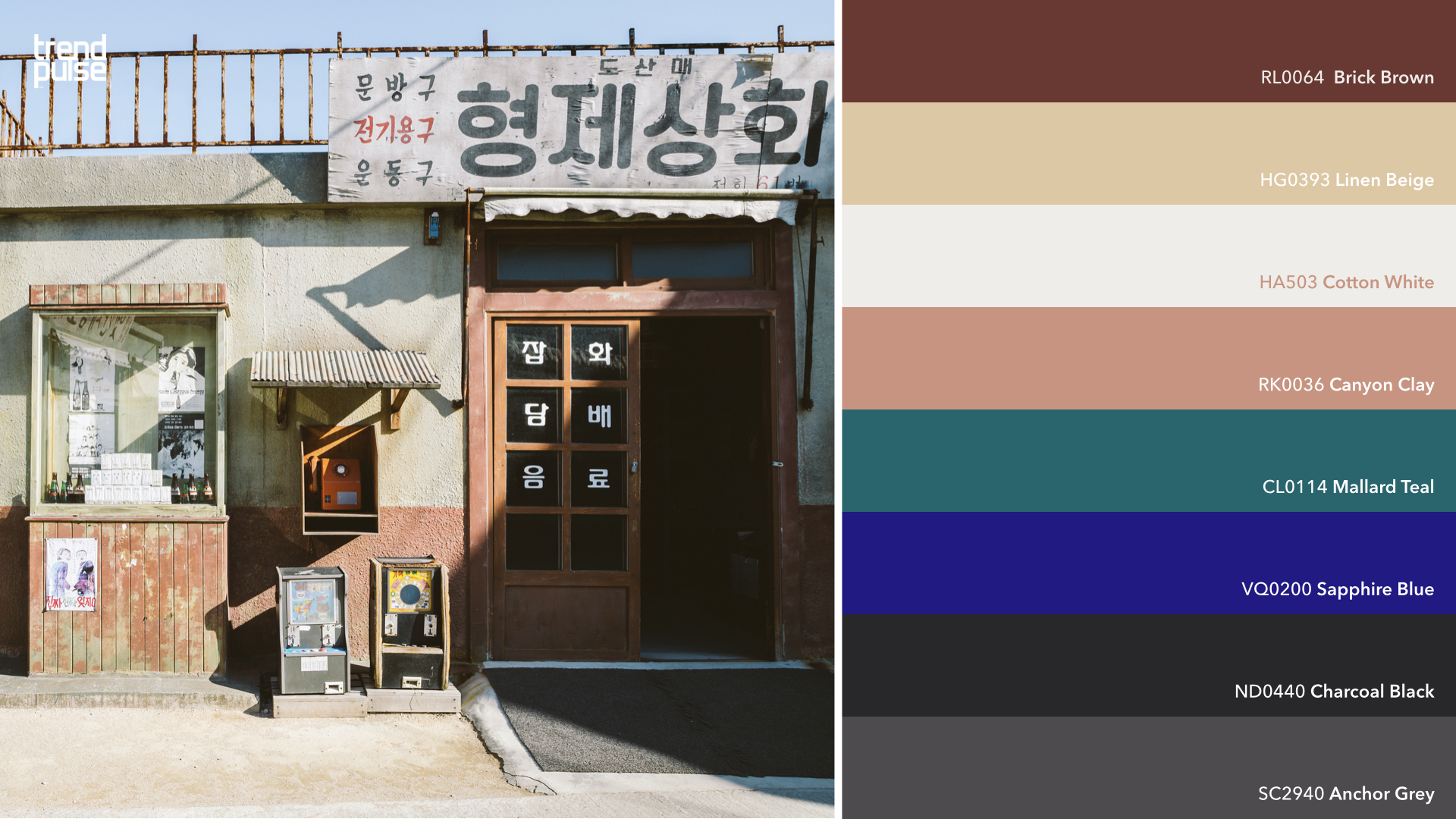 과거부터 현재까지 우리가 수없이 지나쳤을 주변의 흔한 풍경이 영감이 된 컬러. 시대를 불문하고 시간에 따라 자연스럽게 형성되는 컬러를 메인으로 브릭(brick), 클레이(clay), 틸(teal) 컬러와 같이 토속적이고 지역적 문맥의 컬러가 익숙하면서도 새로운 느낌을 만들어 낸다.