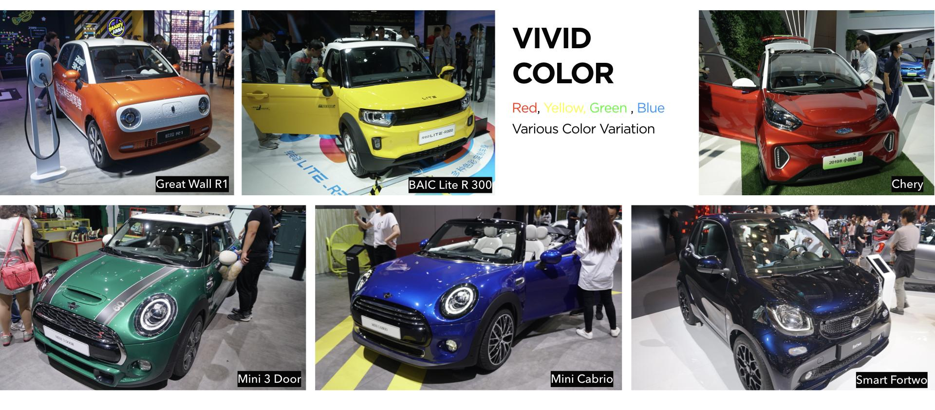 레드, 오렌지, 옐로우, 그린, 블루 등 다양한 Vivid tone이 자동차 바디에 과감하게 적용되어