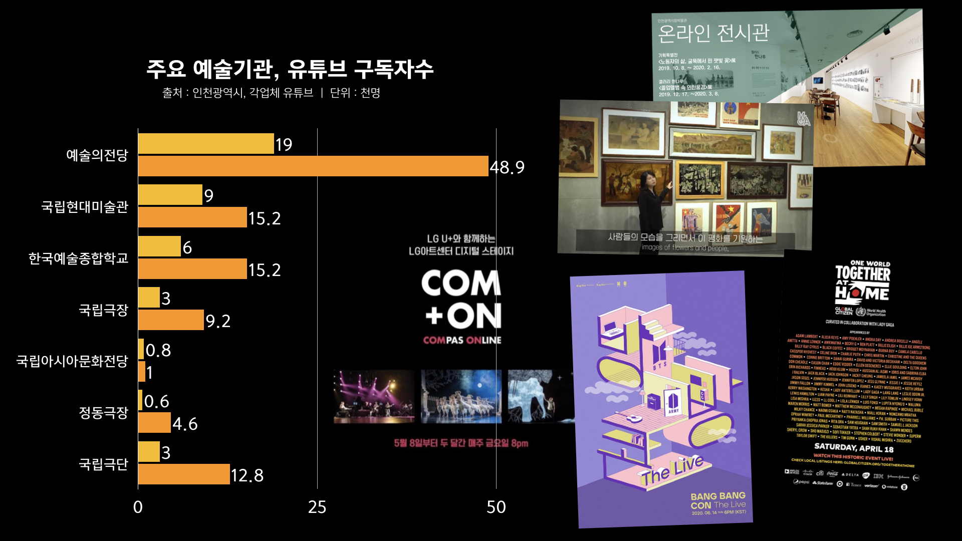 과거 대규모 인원이 동원되었던 음악회와 콘서트, 뮤지컬 공연 같은 활동도 이젠 온라인을 통해 참여가 가능하다.