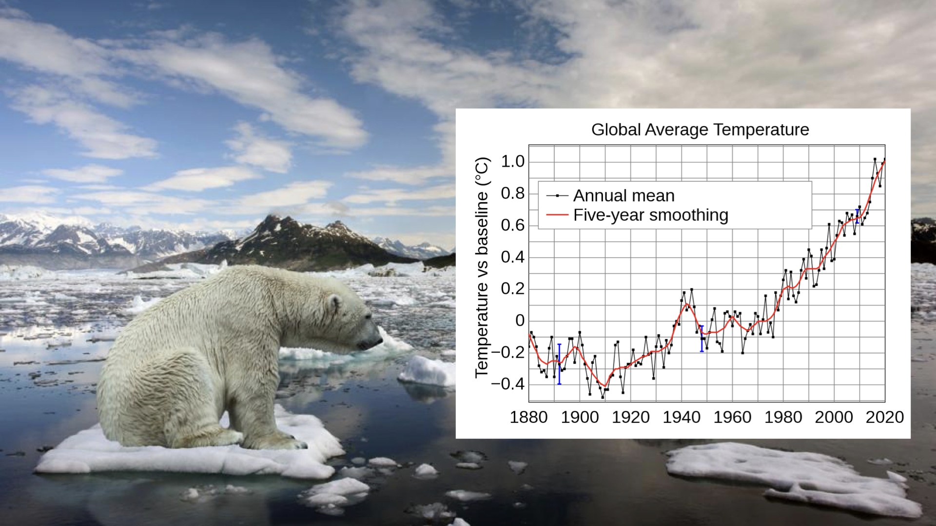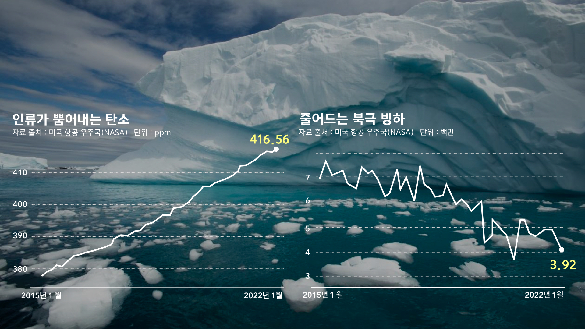 빠른 속도로 녹아내리는 북극 얼음 사이 지쳐있는 북극곰의 모습은 지구 온난화를 상징화하는 대표 이미지이다.