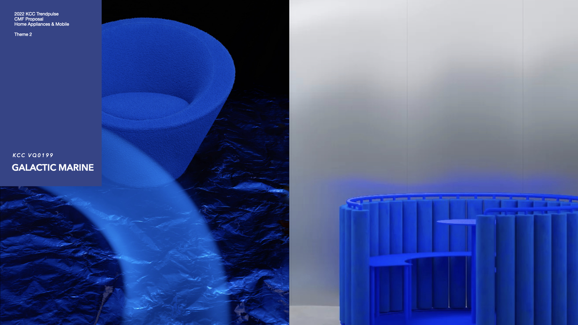 Galactic Marine(갤락틱 마린)은 디지털과 현실을 연결하는 컬러에서 블루는 빼놓을 수 없는 대상이다. 평정심, 안도감 등 전년 대비 약간은 창백하면서 밝은 톤으로 실재감을 선사하는 컬러로 제안된다. 사이버틱한 블루의 특성을 가지고 있으면서도, 자연이 가지고 있는 블루 스펙트럼을 닮으려는 성질이 돋보인다. 그라데이션으로 표현되는 블루 스펙트럼은 제품을 시각적으로 더 볼륨감있고 풍성하게 만들어주는데 도움이 된다.