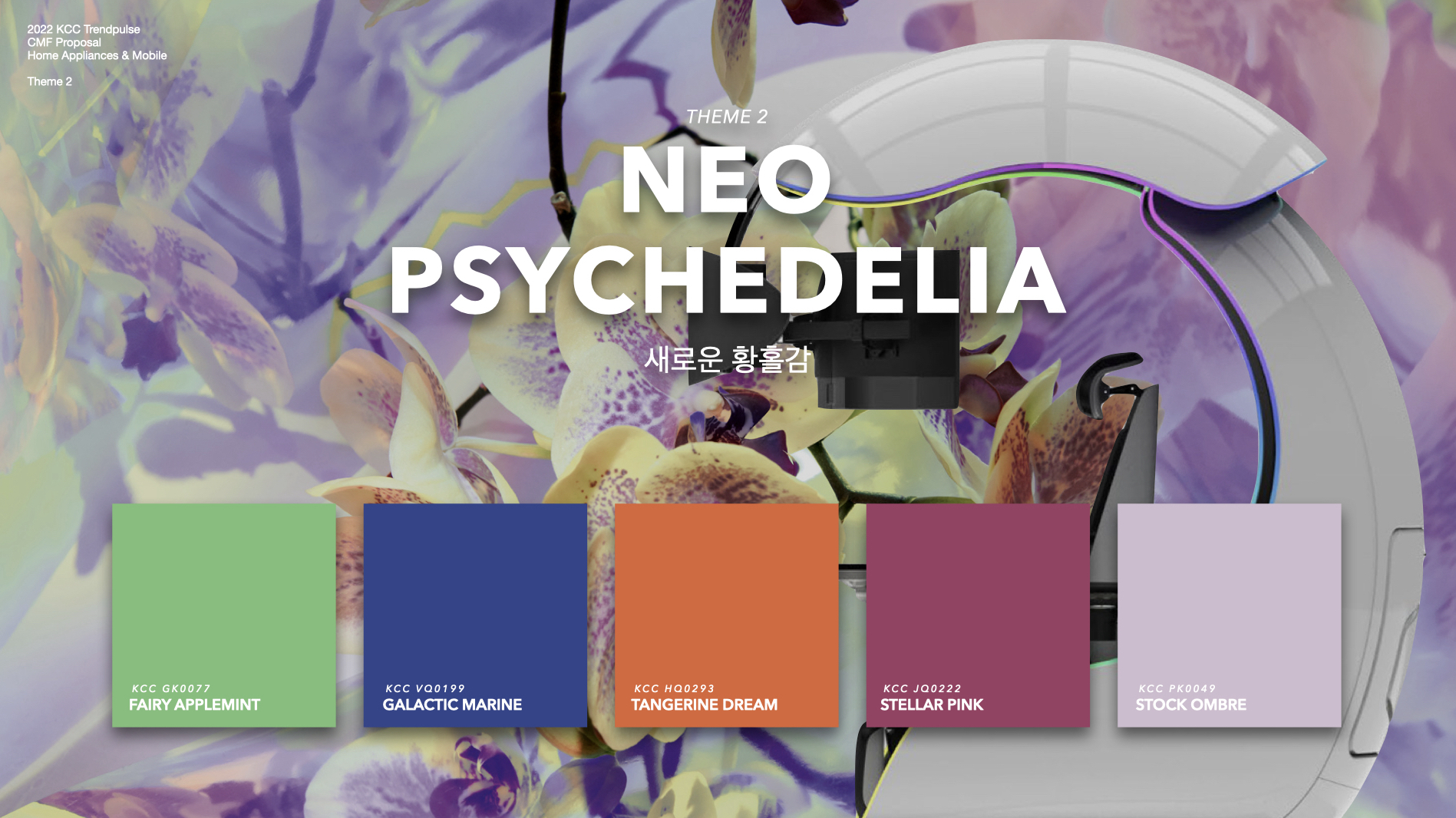 Home Appliances & Mobile CMF 파트에서 제안하는 테마 2 'Neo Psychedelia(새로운 황홀감)'에서는 다음과 같이 5가지 컬러가 제안된다.