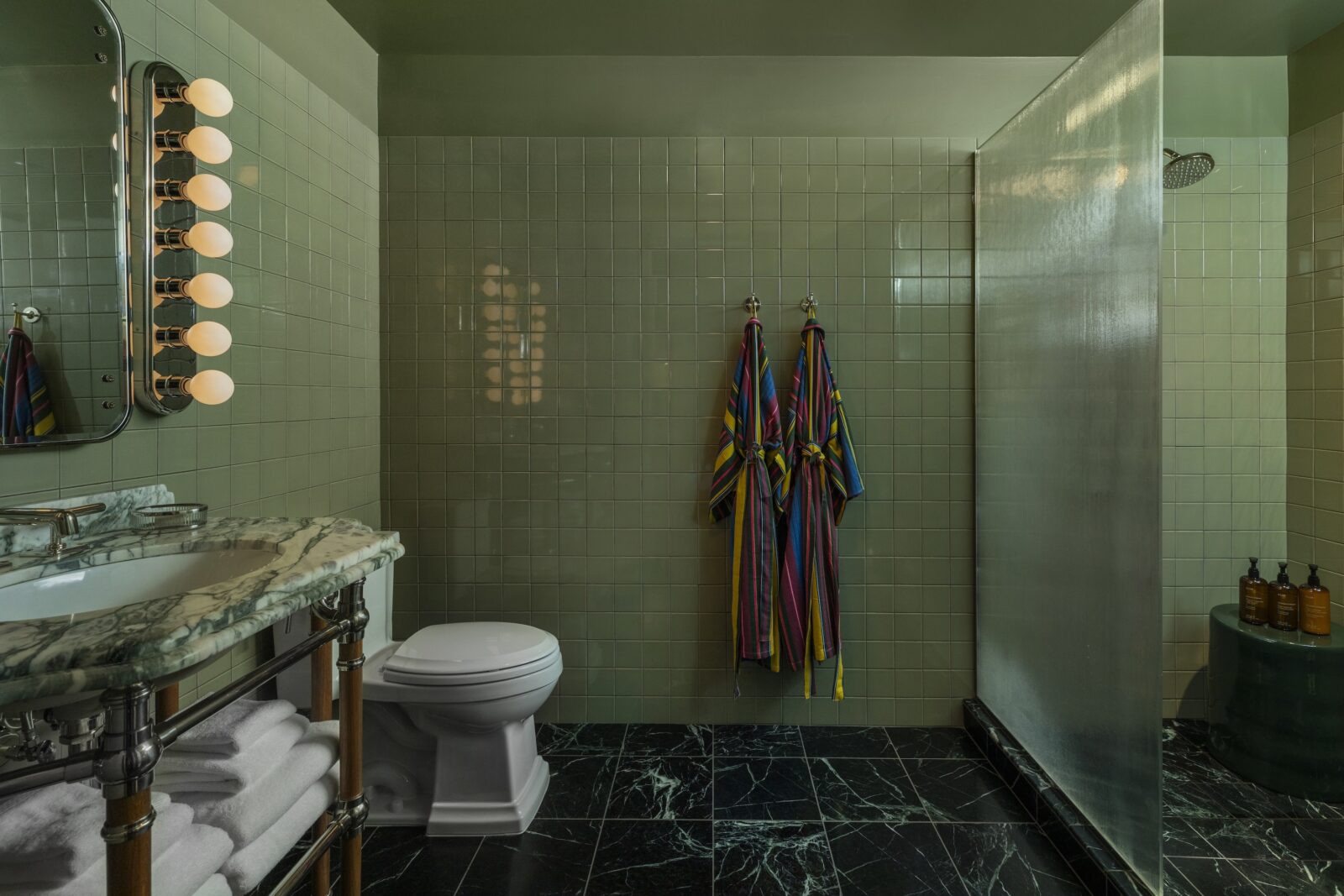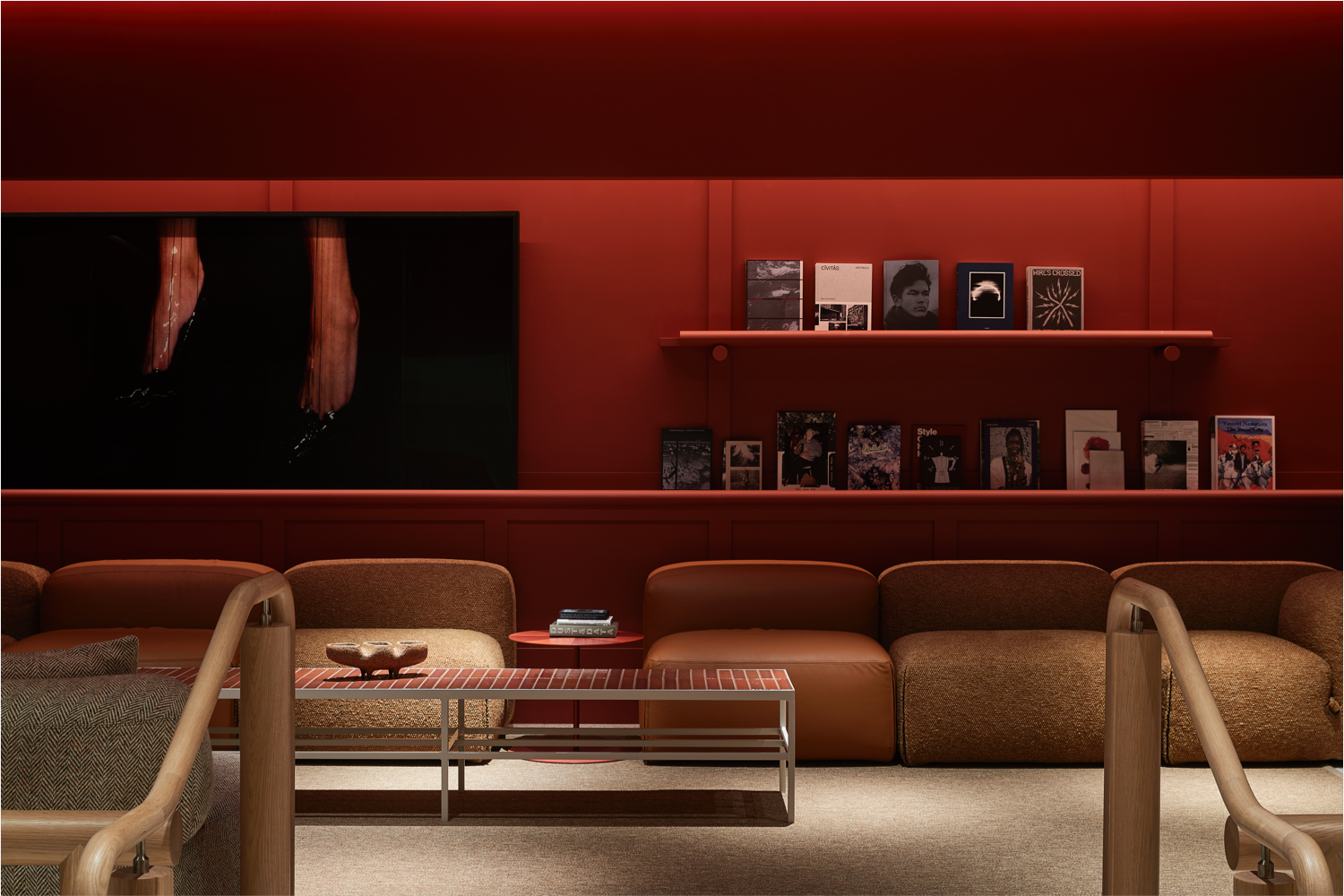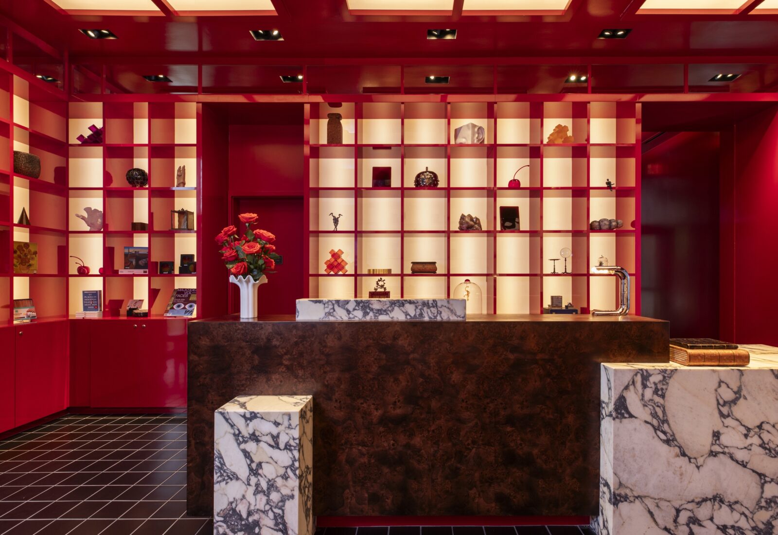 하지만 안으로 들어가보면 인테리어는 굉장히 화려한데, 로비에서 눈에 띄는 붉은 래커 벽, Calacatta Viola 대리석 리셉션 데스크, 판매용 아트 상품이 진열된 선반은 첫인상을 갤러리처럼 느끼게 한다. 호텔 내 레스토랑인 Perseid는 악센트 있는 옴브레 벽으로, 1970년대 감성의 리스닝 룸은 있어 Otari 릴투릴 테이프 데크와 레코드 플레이어가 설치되어 분위기 있는 사운드 경험도 함께 선사한다. 강렬하고 채도 높은 톤들로 공간을 채우고, 아트풀한 내러티브를 구현하고 있다.
