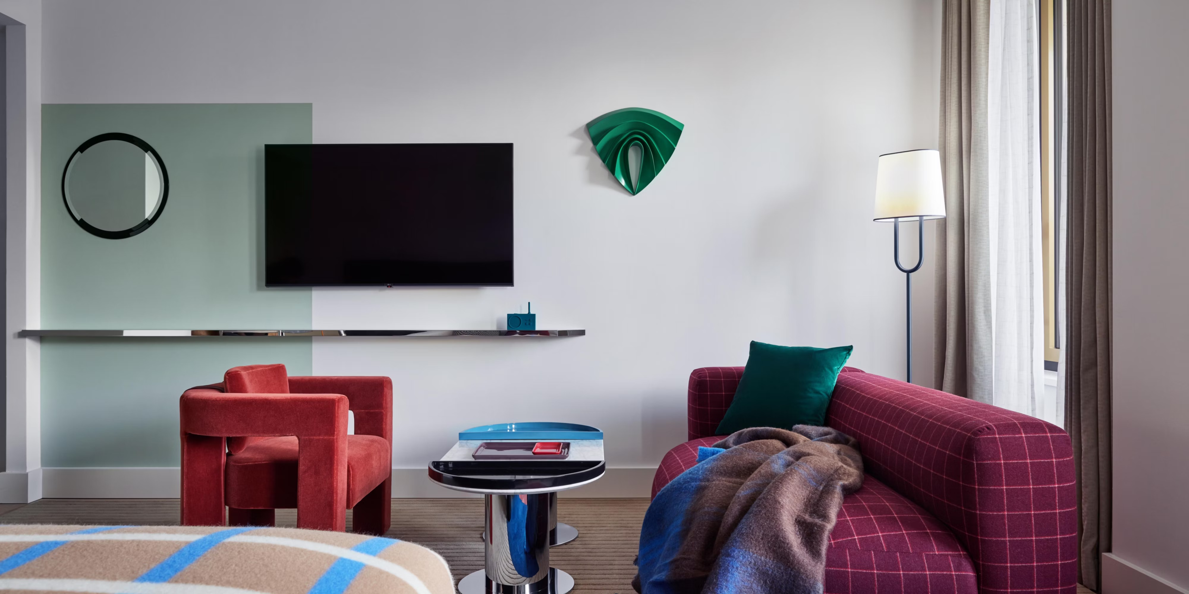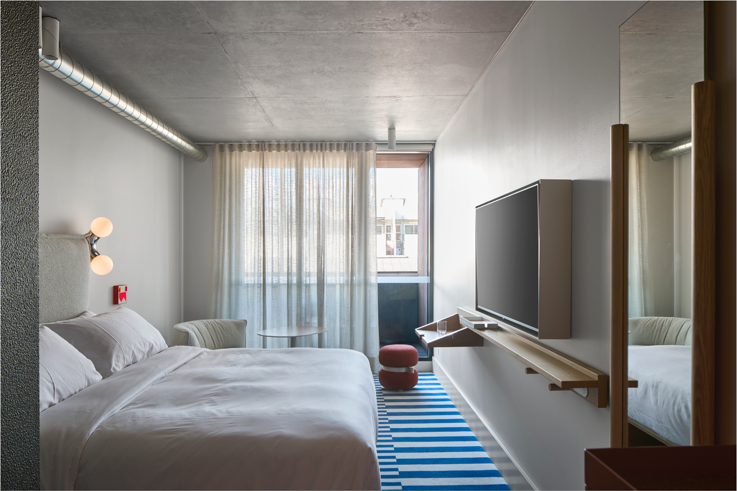 객실 곳곳에 강렬한 원색과 크롬 포인트를 전략적으로 배치해 디자인적 긴장감을 유도한다. 로비에는 빨간색 리셉션 데스크와 벨벳 쿠션·파란색 장식이 시선을 집중시키며, 이는 차가운 도시적 배경에 정서적 따뜻함과 시각적 대비를 부여하는데, 디자이너들은 Bauhaus 기반의 미니멀리즘에 playful 요소, 즉 원색과 크롬을 정서적 균형 장치로 활용하는 전략을 활용하고 있다.