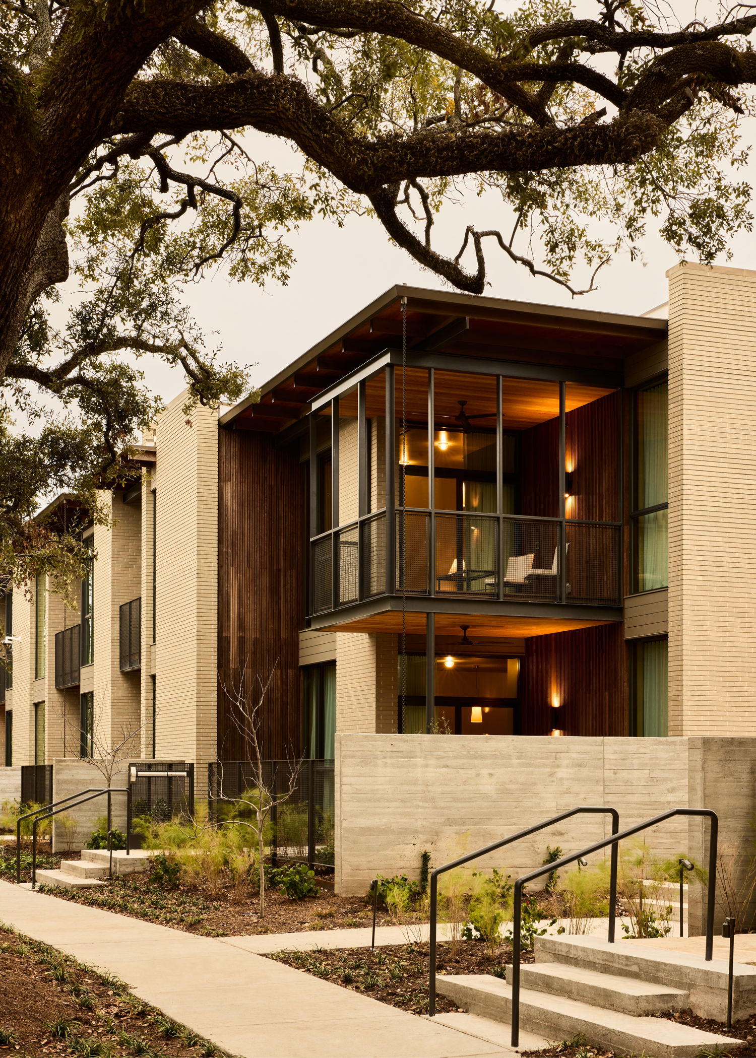 호텔 생 오귀스틴은 2024년 12월 15일 휴스턴 몬트로즈 뮤지엄 로우 인근에 문을 연 Bunkhouse Hotels의 첫 휴스턴 지점. 사실 외관은 엄청나게 특별하진 않다. 주변 지역에 위치한 건물 외관 컬러 팔레트와 저층의 레지덴셜 스케일을 존중해 건축했기 때문. 총 71개 객실이 다섯 채의 2층 규모 건물에 나뉘어 구획되고, 이들은 우드 보드워크와 브리지로 모두 연결된 모습이 특징.