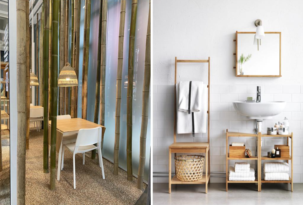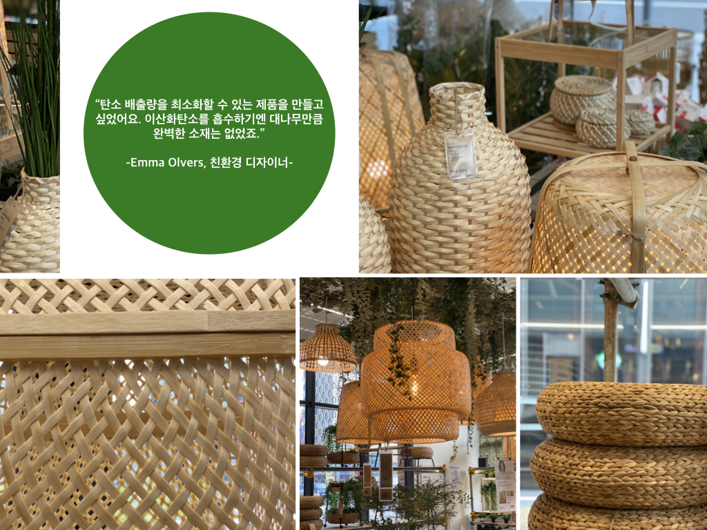 폐플라스틱 다음으로 전시되어있었던 소재는 ‘대나무’이다. 1년에 평균 30cm를 자라는 일반 나무와 달리, 대나무의 성장속도는 이보다 빠른 하루 최대 1m이다. 이 둘의 자생력 차이가 어마어마한 것이다. 많은 공급량을 감당하기 위해 매일 수만 개의 산림이 파괴당하고 있었던 자연에게 대나무는 그야말로 최고의 대안이라 할 수 있다. 이케아는 이러한 대나무로 만든 여러 부속들을 선택하여 다양한 구성으로 활용할 수 있는 이바르 IVAR 시스템 (조립식 가구들을 직접 매칭 해 구매하는 형식)을 정착시키며 소비자들이 직접 자유롭게 만들고 활용할 수 있는 환경을 제공한다. DIY 홈퍼니싱에 최적화되어있는 이 시스템은 무가공 대나무 가구들로 구성되어 있어 셀프 페인팅이 훨씬 쉽다는 점이 장점이다.