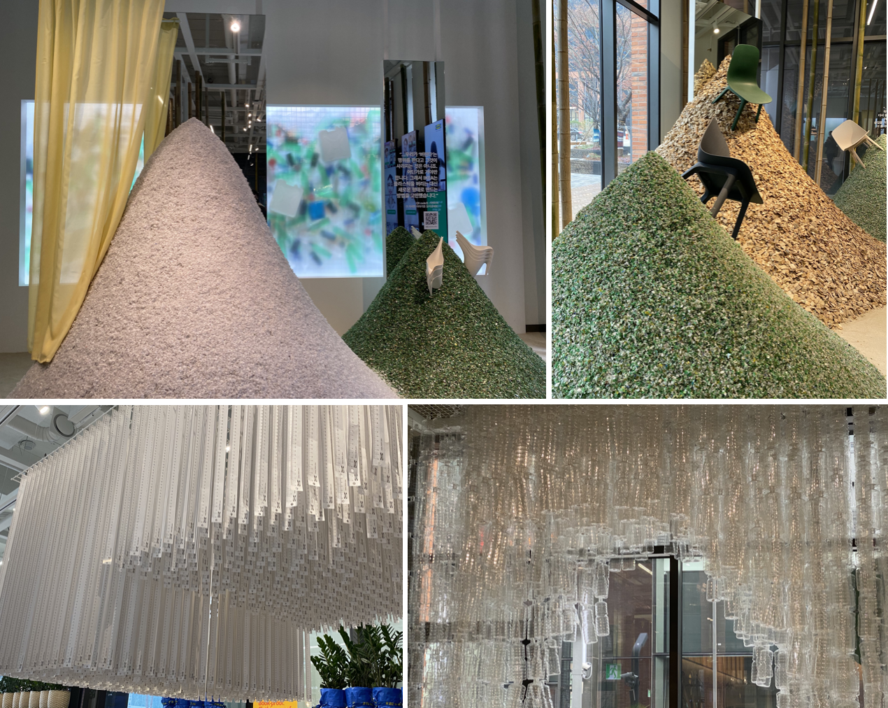 환경오염의 주 된 원인인 폐플라스틱, 환경부에 따르면 코로나 19 여파로 세계 경기 침체 현상이 확산되며 특히 폐플라스틱의 수출 길이 막혔다고 한다. 폐기물의 재활용률 수치가 60-70% 에서 40%로 감소하며 폐플라스틱이 폐기되는 대로 쌓이고 있는 것이다. 이케아에서는 이러한 문제점을 해결하기 위해 옥수수 전분이나 사탕수수로 만든 분해가 가능한 플라스틱을 주 소재로 사용해 친환경적이고 저렴한 가격을 브랜드 장점으로 내세우고 있다. 쌓인 폐플라스틱 탑 위에 전시된 의자와 커튼은 고객들로 하여금 숨겨진 소재의 이야기에 한번 더 집중할 수 있게 함으로써 그 메시지를 전달한다.