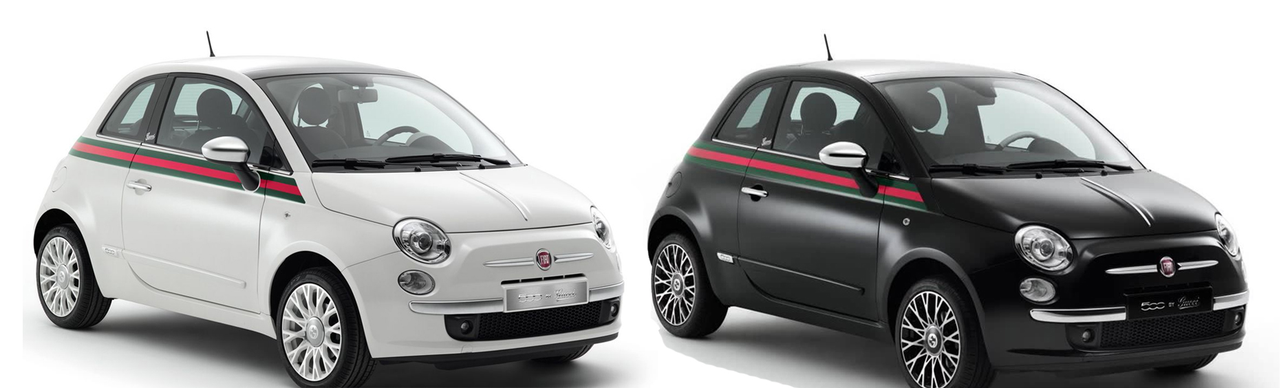 먼저 자동차 x 패션 콜라보에서 가장 클래식하고 가장 역사에 오래 남은 콜라보는 바로 이탈리아 통일 150주년 & 구찌 설립 90주년을 기념하기 위하여 진행된 피아트와 구찌의 협업이다. 이 콜라보는 누가보아도 ‘이탈리아다’ 할 정도로 그들만의 감성과 재치를 가지고 있다. 블랙 & 화이트로 이루어진 외장 컬러는 구찌의 상징인 빨강-녹색띠가 아주 자연스럽게 입혀져 있고, 내장에도 역시 마치 구찌를 둘러 감은듯한 느낌을 전달하는 안전벨트가 매우 상징적이다.