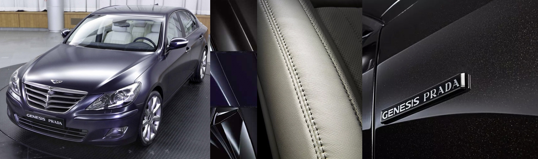 잠깐, 국내 콜라보도빼먹을 수없다. 프라다가 최초로 선택한, 심지어 앞서 언급한모델들보다더 예전인, 2009년 서울 모터쇼에서 공개된 제네시스 x 프라다가 있다. 럭셔리 모델인 제네시스와 명품 프라다의 콜라보는 블랙 네로(Black Nero), 블루 발티코(Blue Baltico), 브라운 모로(Brown Moro) 총 3가지의 컬러로 외관부터 럭셔리한 명품 느낌을 선보인다. 추가로 그릴, 아웃사이드 도어핸들, 그리고 엠블럼에다크 한크롬색상을 적용해 고급스러운 무게감을 더했다. 내부엔 프라다의 시그니처인 사피아노 패턴의 천연 가죽이사용됐다.