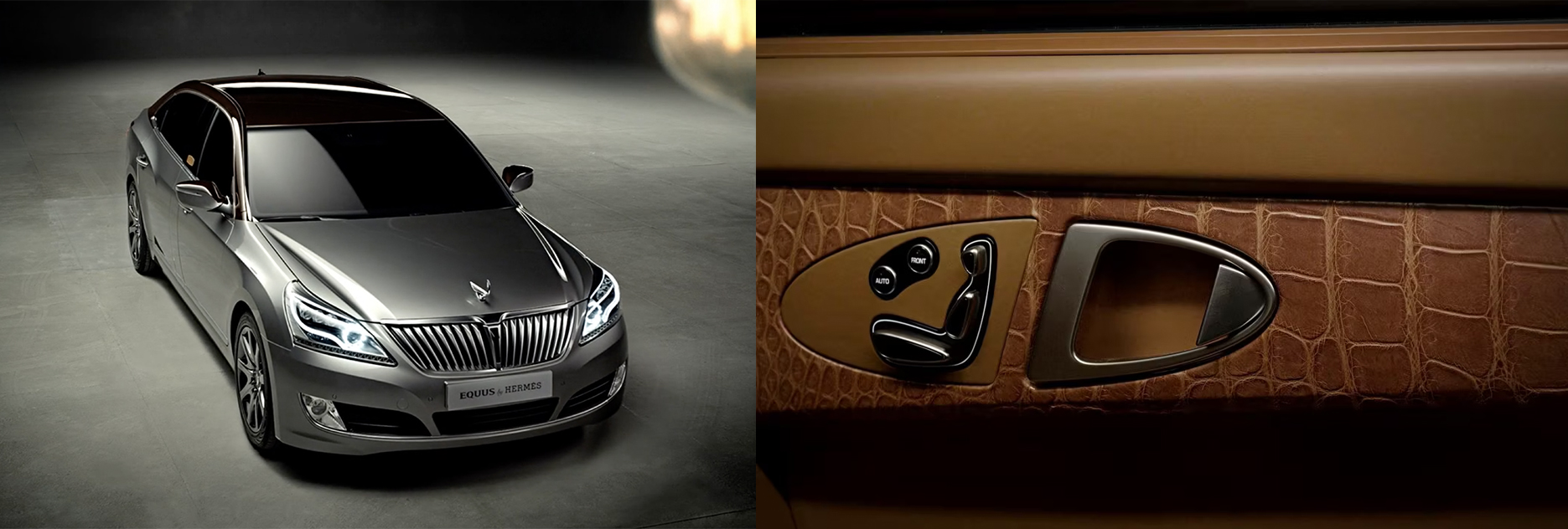 또한 에르메스도 부가티 이전에 에쿠스와 먼저 손을 잡았었다. 2013년에 공개된 컨셉카 ‘Equus by Hermes’는 대한민국의 대표 럭셔리 자동차과 글로벌 럭셔리 끝판왕 에르메스가 만나 탄생한 모델이다. 이 모델에선 에르메스의 특유의 무드가 실내에서 두드러진다. 장인의 바느질, 버킨백의 악어가죽을 담은 도어트림과 말굽 편자 모양의 도어 핸들 등과 함께 에르메스 특유의 Cognac brown 컬러가 중점으로 사용됐다. 외장의 경우 현대자동차에서 이전에 선보인 적 없던 바디와 필러를 나눈 투톤의 실버컬러와 브라운 에보니 컬러, 그리고 무광택 크롬을 적용했다.