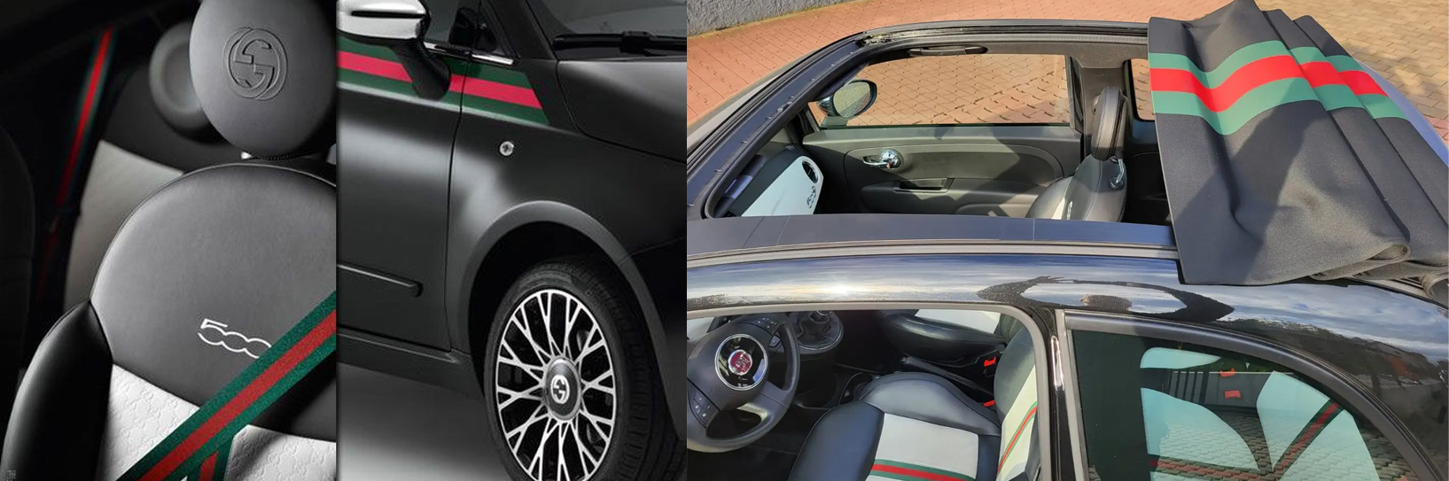 먼저 자동차 x 패션 콜라보에서 가장 클래식하고 가장 역사에 오래 남은 콜라보는 바로 이탈리아 통일 150주년 & 구찌 설립 90주년을 기념하기 위하여 진행된 피아트와 구찌의 협업이다. 이 콜라보는 누가보아도 ‘이탈리아다’ 할 정도로 그들만의 감성과 재치를 가지고 있다. 블랙 & 화이트로 이루어진 외장 컬러는 구찌의 상징인 빨강-녹색띠가 아주 자연스럽게 입혀져 있고, 내장에도 역시 마치 구찌를 둘러 감은듯한 느낌을 전달하는 안전벨트가 매우 상징적이다.