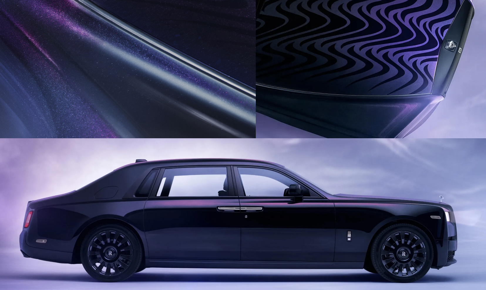 롤스로이스의 신토피아는 Iris Van Herpen의대표적인 초현실적이고 판타지스러운 요소를 표현한 그래픽을 이와 어울리는 몽환적인 보라색 외장에 표현했다.
