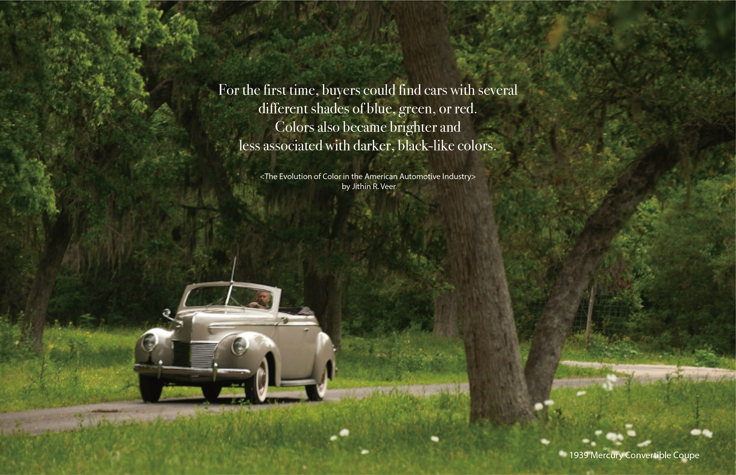 자동차 산업의 초창기에는 컬러는 그다지 중요한 이슈가 아니었다. 자동차를 소유하고 있다는 것 만으로도 충분히 주목받았기 때문이다. 이 시기의 자동차는 마차를 끌던 말의 자리를 동력장치가 대신한 것을 제외하고는 거의 마차의 형태에 가까웠다. 얼마 지나지 않아 블랙, 그레이, 어두운 계열의 레드나 그린컬러의 자동차도 생산되기는 했었으나 경제성과 효율성의 이유로 블랙이 대세를 이루게 되었다.