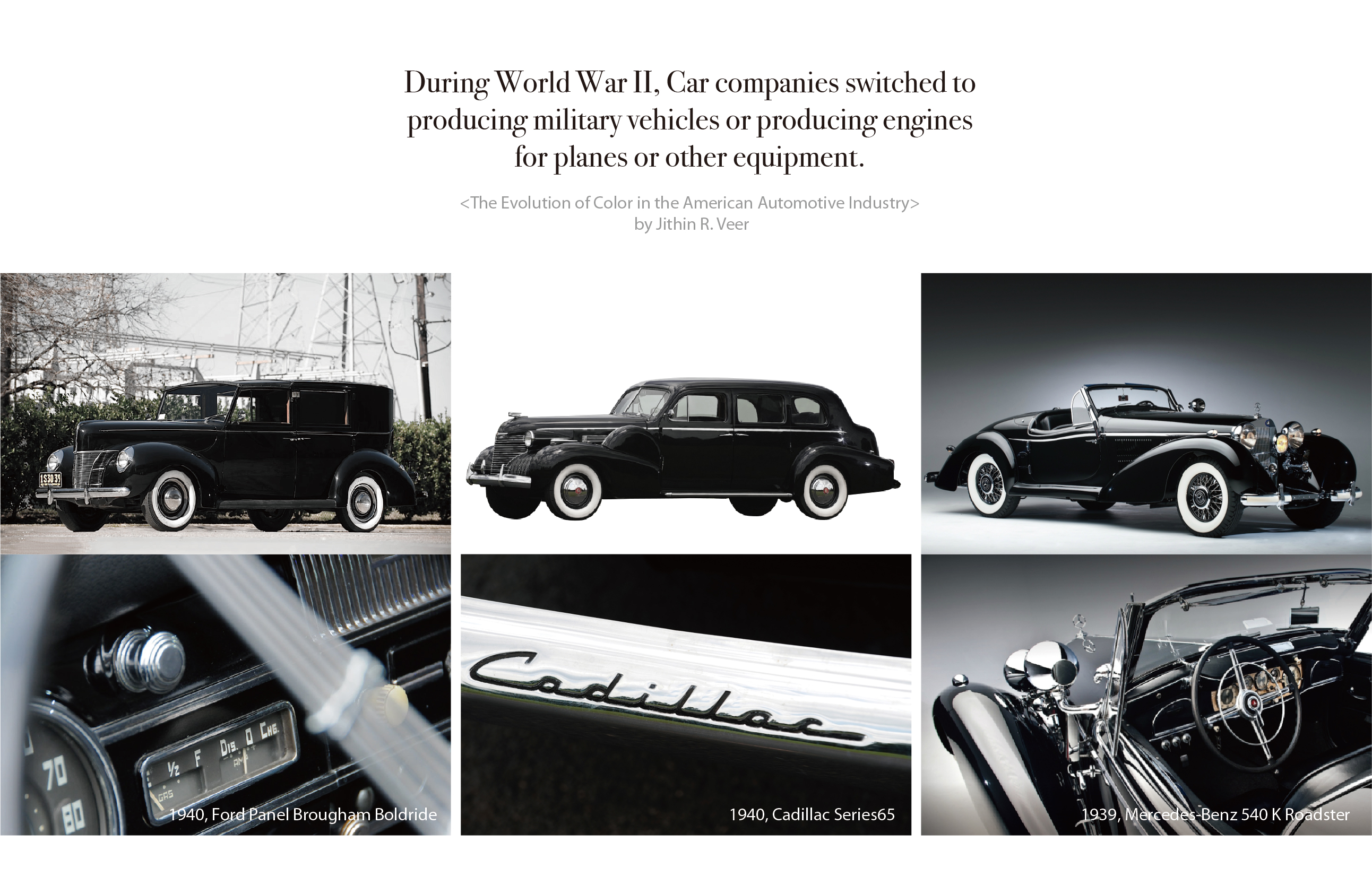 1940년대 자동차 산업은 2차 세계대전 중 군수산업에 동원되었다. 이전 시기에 확산된 자동차의 다양한 컬러는 군용품의 효율적 생산이라는 명목하게 다시 한가지 블랙컬러로 통일되었다. 장식은 사라졌으며, 화려한 유선형의 디자인은 단순화되었다. 이 시기의 컬러는 블랙 한 가지로 축소되었지만, 지프나 스포츠카 등 다양한 종류의 자동차가 등장하게 된 계기가 되기도 하였다.
