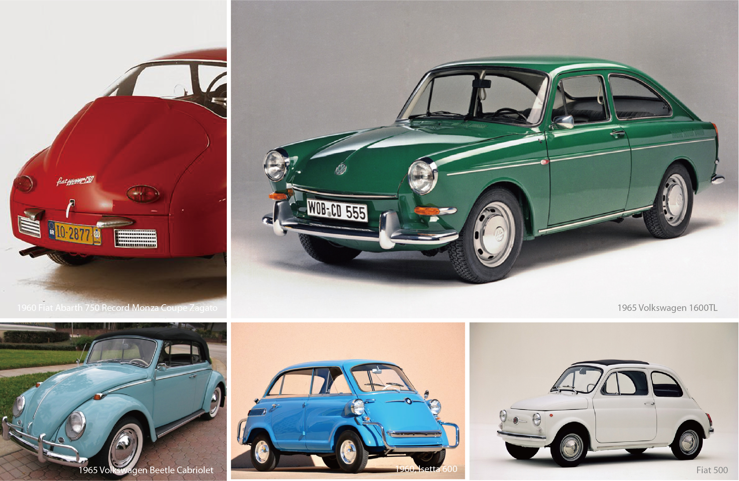 미국의 자동차 디자인이 대형화, 고급화, 과감한 색채의 향연이었다면, 동시대 유럽의 자동차는 다소 톤다운된 색채와 소형화의 길을 걷고 있었다. 예를 들어, 독일의 택시는 블랙이었으며 운전자들은 다크블루나 그린, 블랙, 화이트 또는 그레이 계열을 선호했다. 이와 같은 컬러들이 도로 안전에 좋다는 인식 때문이었다. 어떤 이들은 실버 피니쉬를 선호했는데, 이는 레이싱 경주에서 실버 컬러의 벤츠의 자동차가 우수한 성적을 거두며 인기를 끌었기 때문이다. 재미있는 점은 나라마다 선호하는 색상이 레이싱 경기의 자동차 컬러에서도 여실히 드러난다는 것이다. 영국은 '브리티시 그린', 독일은 '실버', 프랑스는 '프렌치 블루', 이탈리아는 '이탈리안 레드' 등 국가별 대표적 자동차 색상이 떠오르는 것은 이 때문이다.