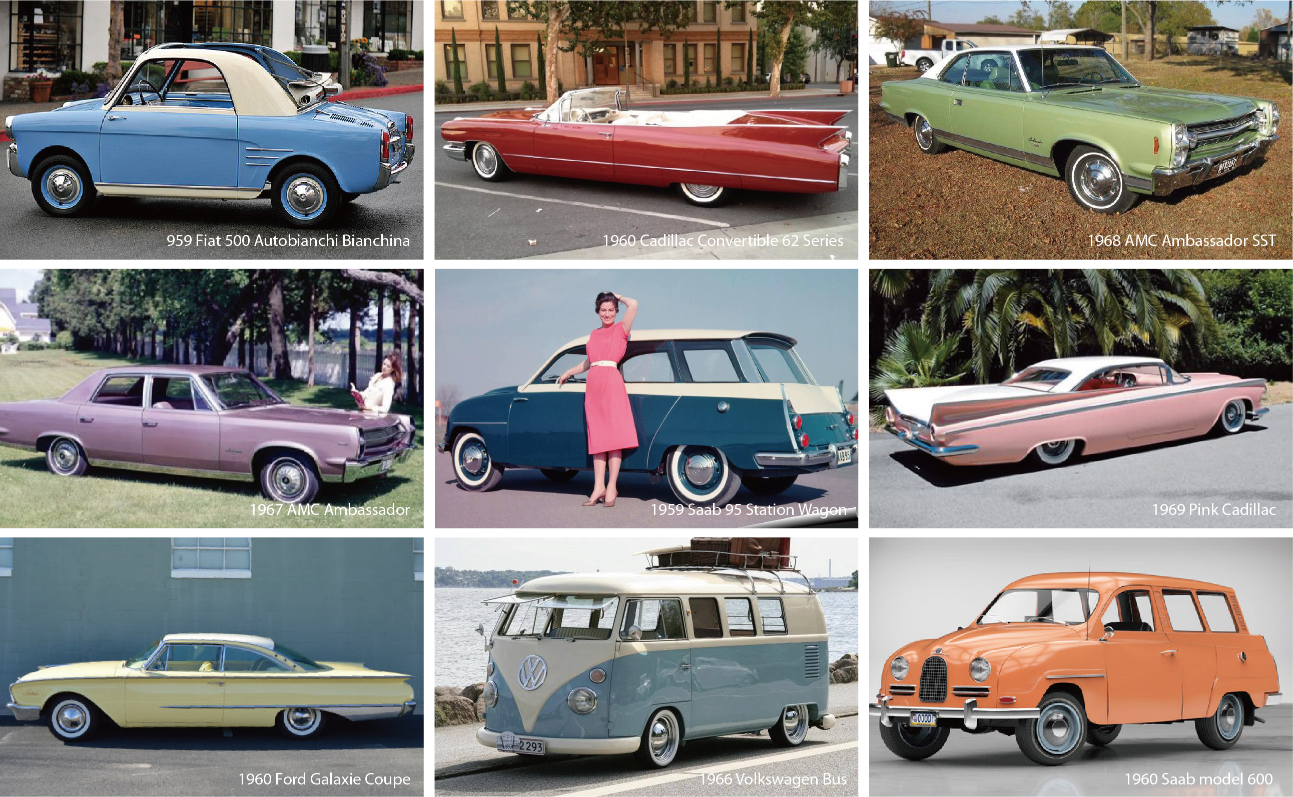 1946년, 파리 쇼에서 처음으로 원색의 컬러풀한 자동차 색상이 등장한다. 미국에서는 기성세대에 반발하듯 클래식한 다크한 톤을 거부한 채 전례없이 선명하고 밝은 색상의 향연이 펼쳐진다. 밝은 톤은 물론이고, 그 어느 때 보다도 선명한 원색과 다양한 톤의 블루, 레드, 그린, 골드, 화이트, 블랙 등 수 많은 화려한 컬러가 등장하여 도로를 정복하였다. 수평으로 나눈 투톤 배색의 컬러는 1960년대 자동차 디자인의 가장 큰 특징이다. 바디와 루프를 다른 색상으로 하거나, 바디를 수평적으로 나누어 두가지 색으로 칠하기도 했다. 이때 절반은 짙은 색상으로, 나머지 절반은 화이트와 같은 밝은 색상을 주로 선호하였다.