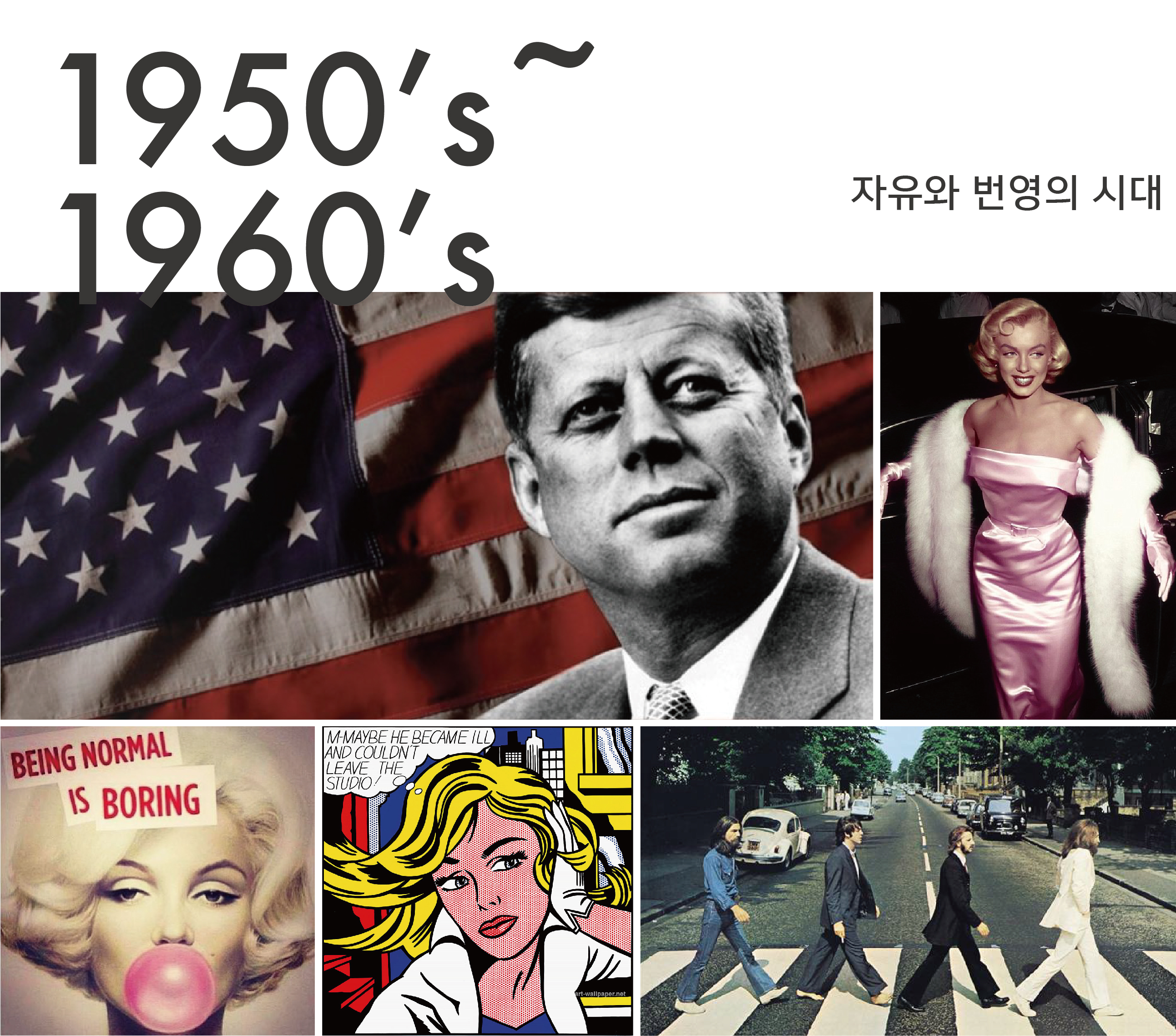 2차 세계대전 이후, 승전국인 미국에 경제적, 문화적으로 풍요로운 시대가 도래하였다. 현대미술의 흐름은 유럽에서 미국으로 넘어왔으며, 문화의 다양성과 자유로움이 인정되었다. 현대미술을 일탈과 파괴를 통해서 새로움과 발상의 전환을 선도하였고, 존 에프 케네디 전 대통령은 미국 자유주의의 상징으로 떠올랐다. 마릴린 먼로는 미디어의 힘을 입어 대중의 욕망을 대변하는 섹슈얼 아이콘으로 자리잡았다. 젋은이들은 비틀즈와 같은 아티스트를 통해 평화에 대한 갈망을 드러내고, 기성세대에 대한 반발을 히피문화를 힘입어 표출했다. 이러한 흐름과 함께 미국 자동차 산업도 전례없던 다양한 색상과 디자인을 선보이며 성공과 모험, 유토피아에 대한 열망을 반영했다.