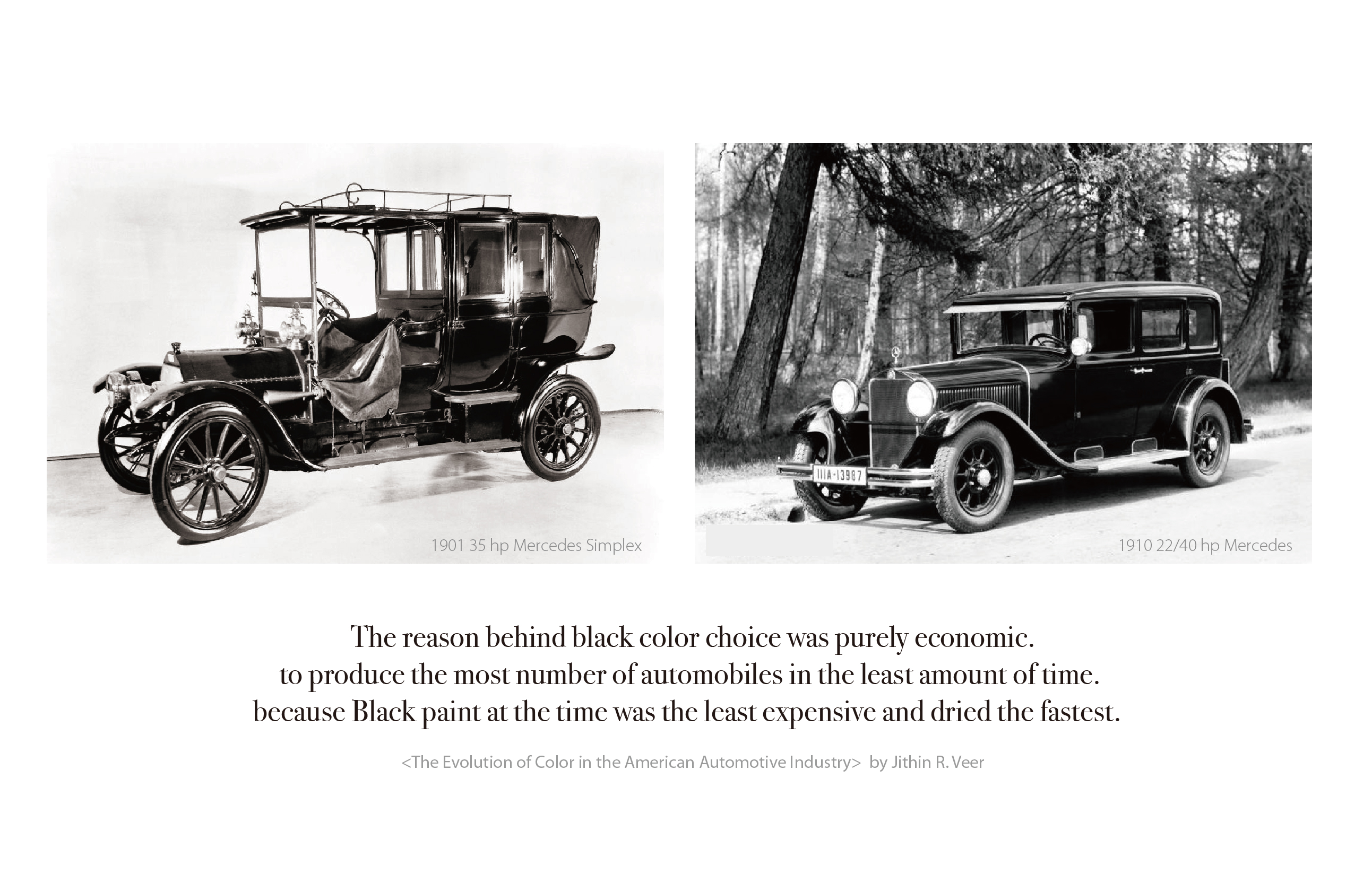 당시에는 페인터가 직접 브러쉬로 여러번 덧칠하여 페인팅하였고, 때문에 정확하고 균일한 컬러를 구현하기가 어려웠다. 블랙 페인트가 건조되는데 필요한 시간은 4~8주. 다른 컬러에 비하면 상대적으로 빠른 편이었다. 초기 증기 기관차나 증기선이 모두 블랙컬러였던 것을 떠올려본다면, 당시의 운송수단이 거의 동일한 컬러로 생산되고 있었음을 알 수 있다.
