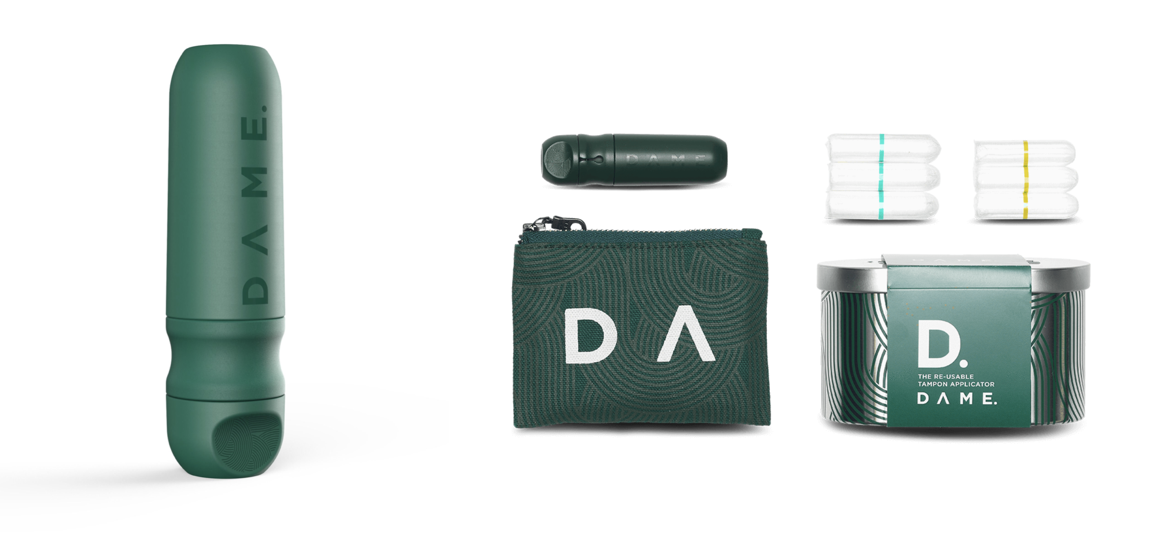 재사용이 가능한 탐폰 어플리케이터 '데임'은 한번쓰고 버려지는 탐폰의 플라스틱 케이스를 대체하는 제품인데, 의료용 수준의 항균 플라스틱으로 만든 이 용기는 자체세척 기능을 갖아서, 케이스 내에 탐폰 흡수재만 넣어 사용하도록 한다. 흡수재는 사용 후 생분해되어 쓰레기를 남기지 않고 탐폰 케이스는 계속 사용할 수 있다.