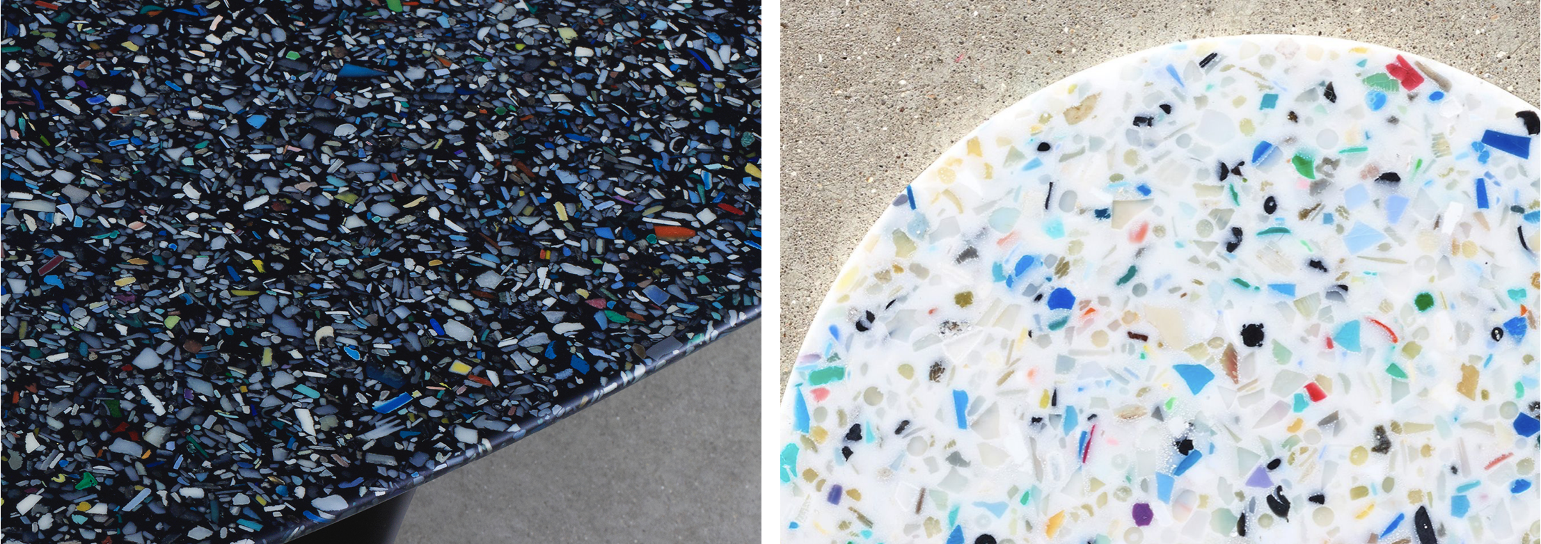 작년 19/20 KCC CMF와 인테리어 트렌드세미나에서도 언급했던 사례들이 좋은 예이다. Brodie Neill의 Ocean Terazzo는 유리나 플라스틱 해양 플라스틱 폐기물을 테라조의 원료로 하여 테이블을 디자인 했다. 테라조는 돌 조각 외에도 플라스틱 조각이나 나무 조각 등 다양한 재활용 소재를 원료로 사용할 수 있기 때문에 지속가능성을 추구하는 디자이너들에게 각광받는 추세다.