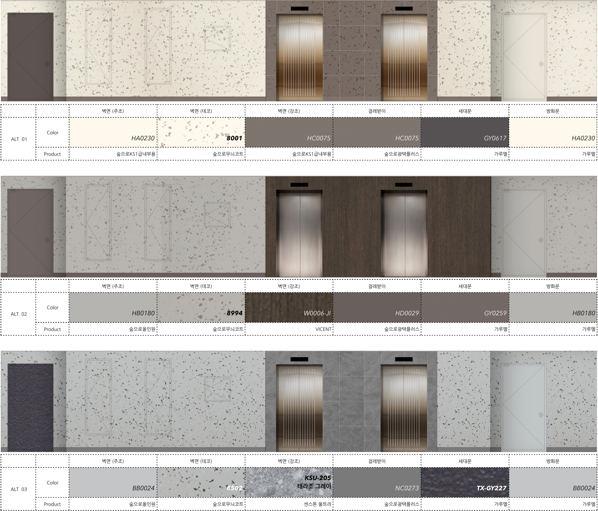 주조색과 톤 온 톤으로 계획된 걸레받이, 세대문, 방화문 컬러는 한 공간에서 조화로운 배색을 보여주고, 엘리베이터 도어나 세대문