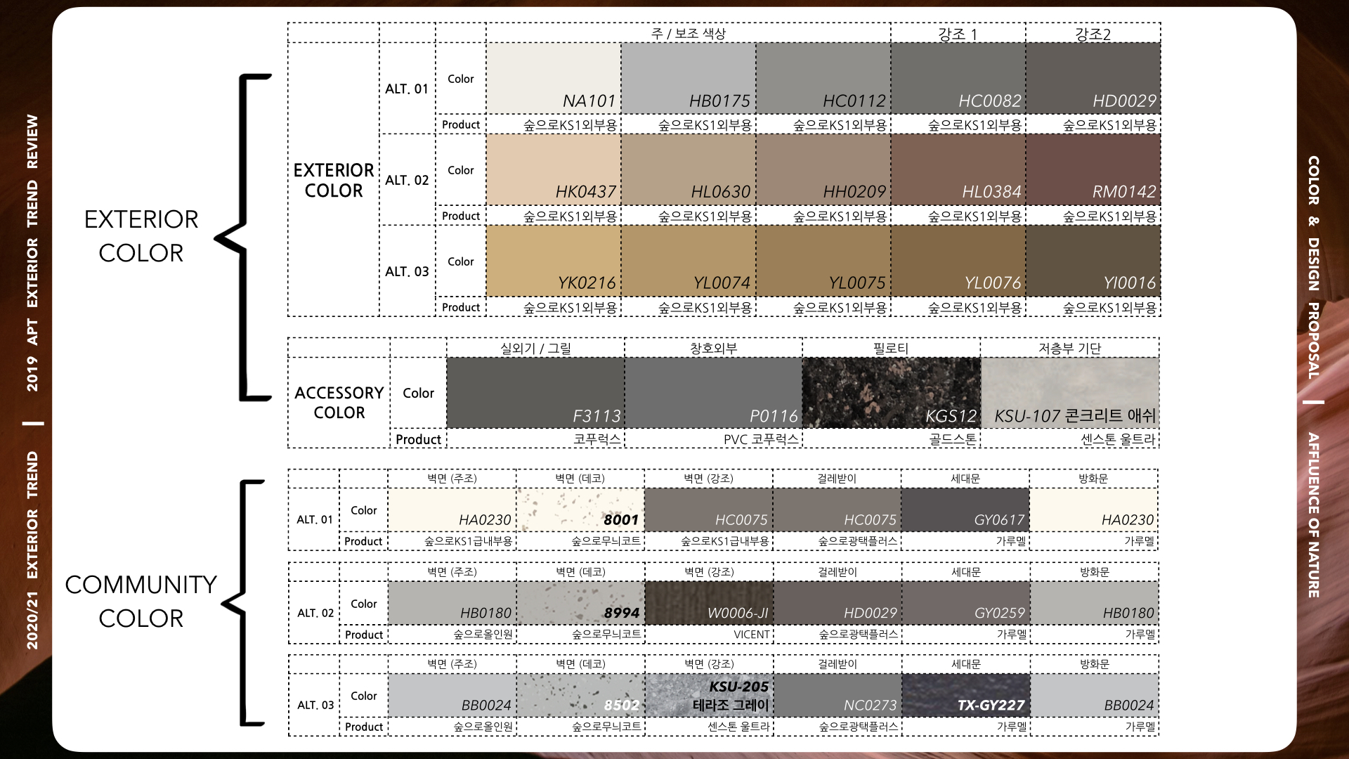 | [ACT] 19/20 익스테리어 트렌드_컬러 & 자재 패키지 제안 #03. (2) | 2020.09.17 |