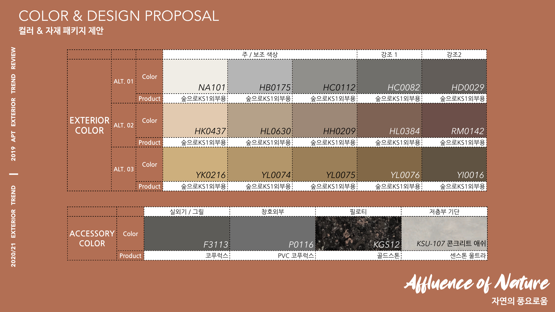 지금까지 제안한 첫 번째 테마, Affluence of Nature의 컬러 및 자재 패키지 제안을 통해 차별화된 고급스러운 색채 계획을 추천한다.