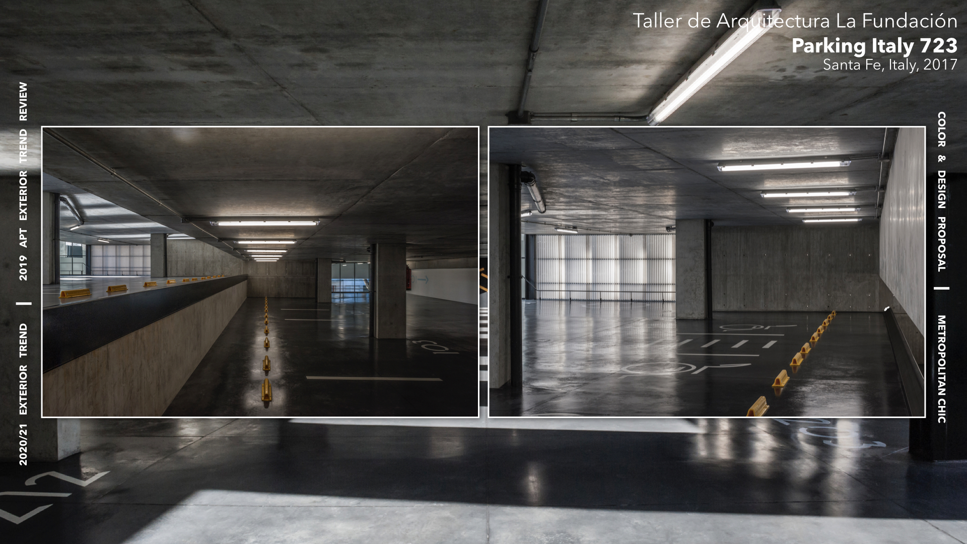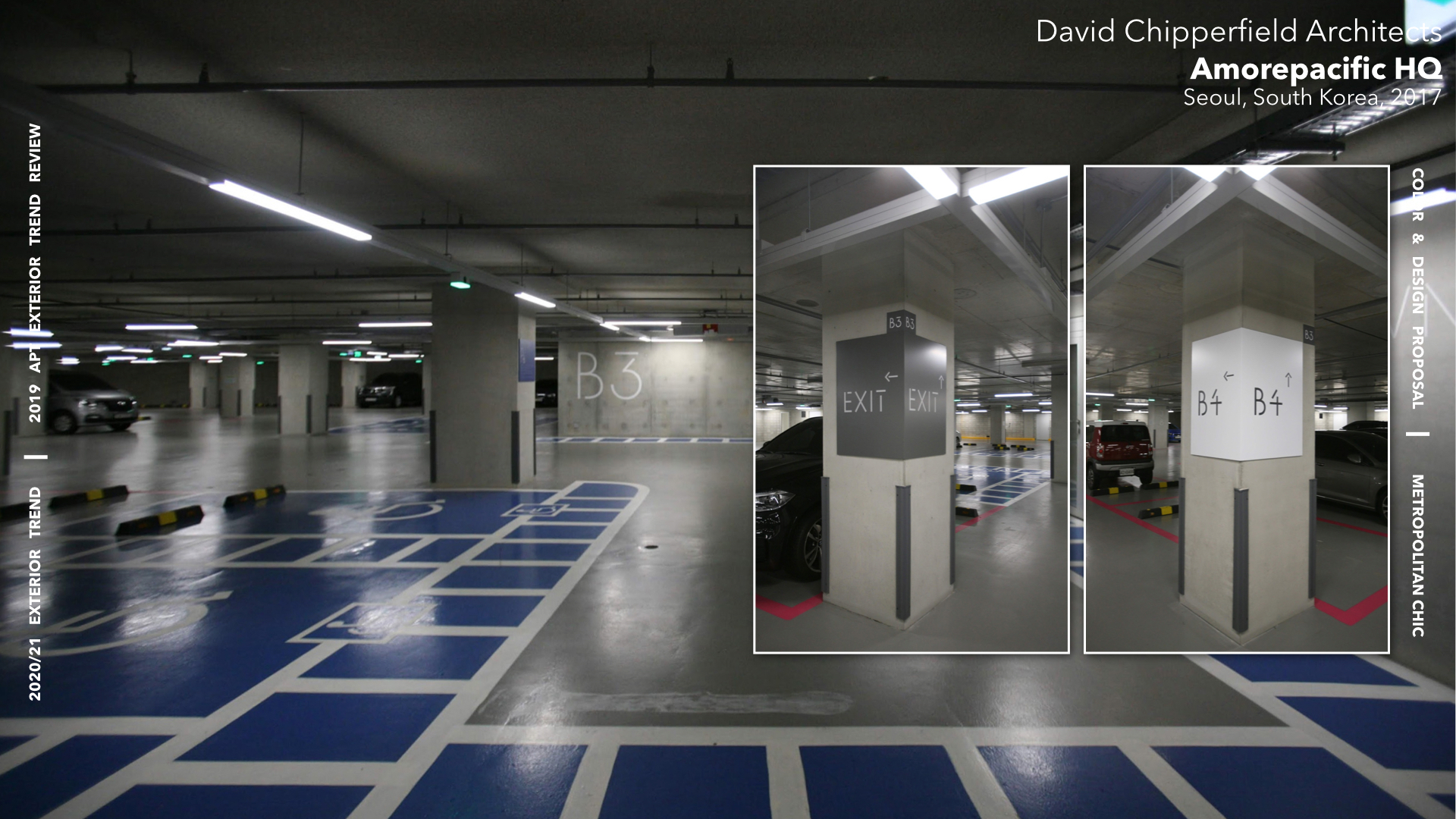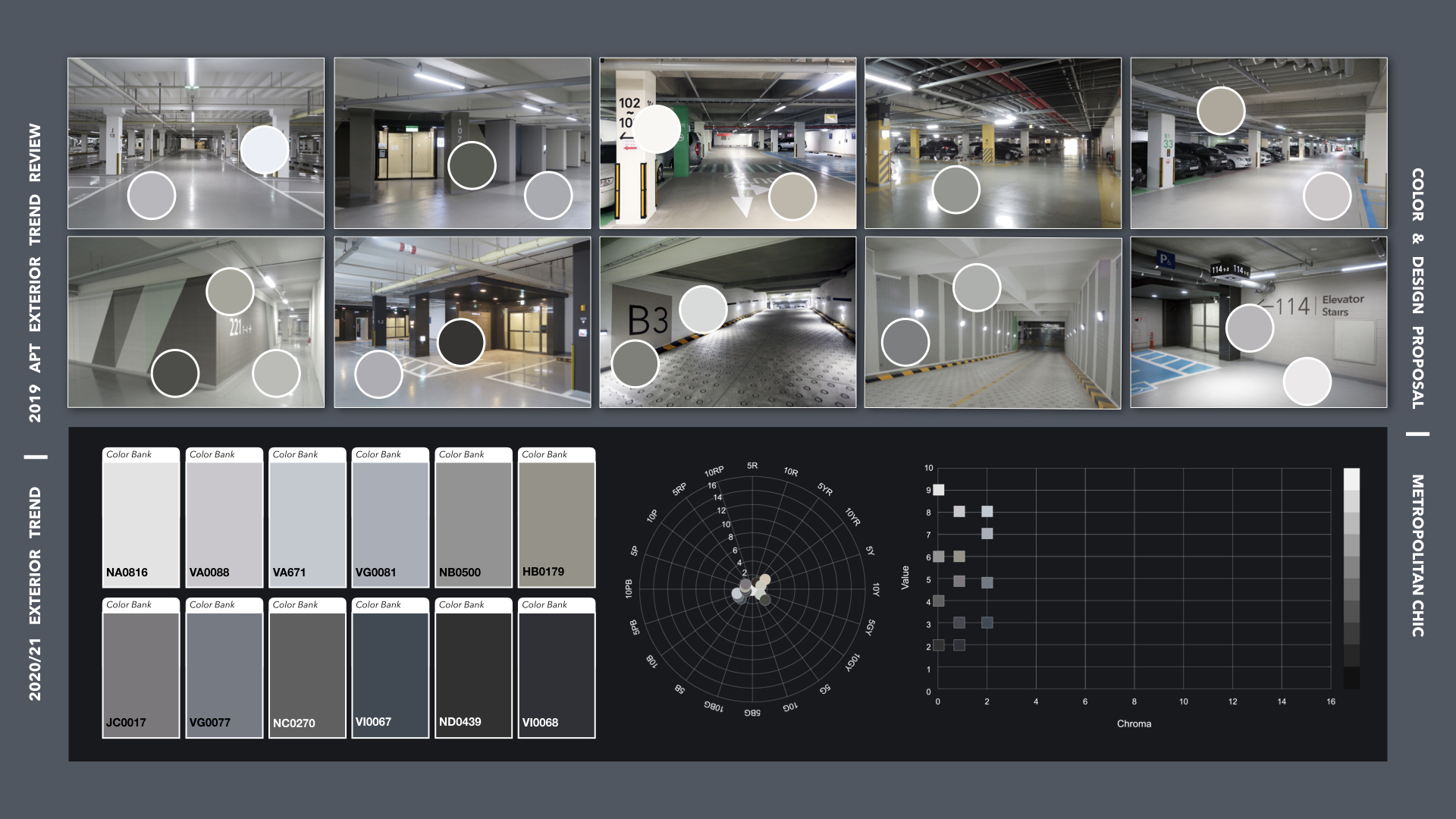 두 번째 테마 Metropolitan Chic의 그레이쉬 컬러 배색으로 외부 입면과 지하주차장에서 모던하고 세련된 컬러의 사용을