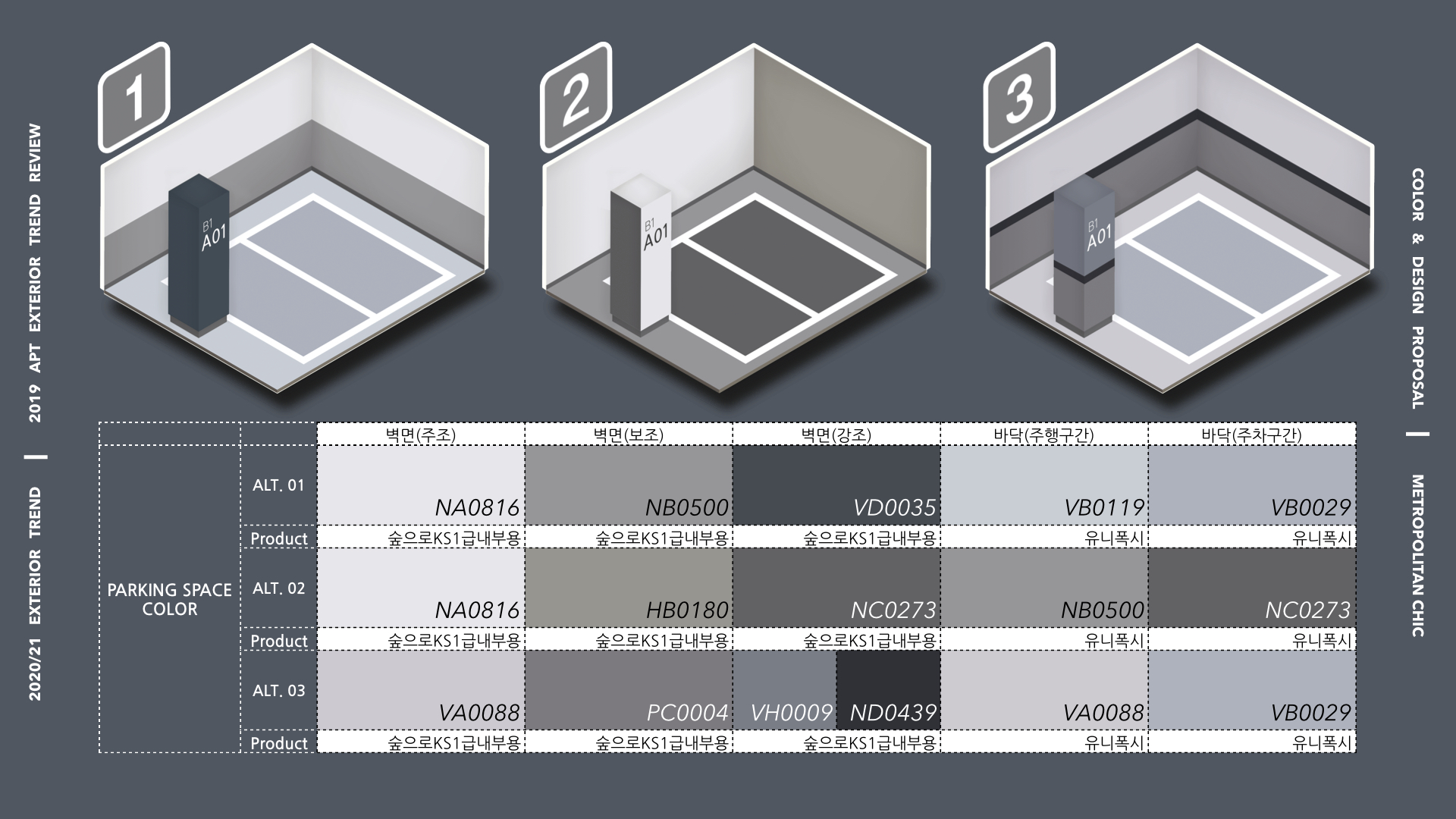 도시적이고 세련된 지하주차장 공간 계획을 위해 3가지 컬러 배색을 제안한다. 벽면은 뉴트럴 계열의 그레이 컬러 위주로 구성하고