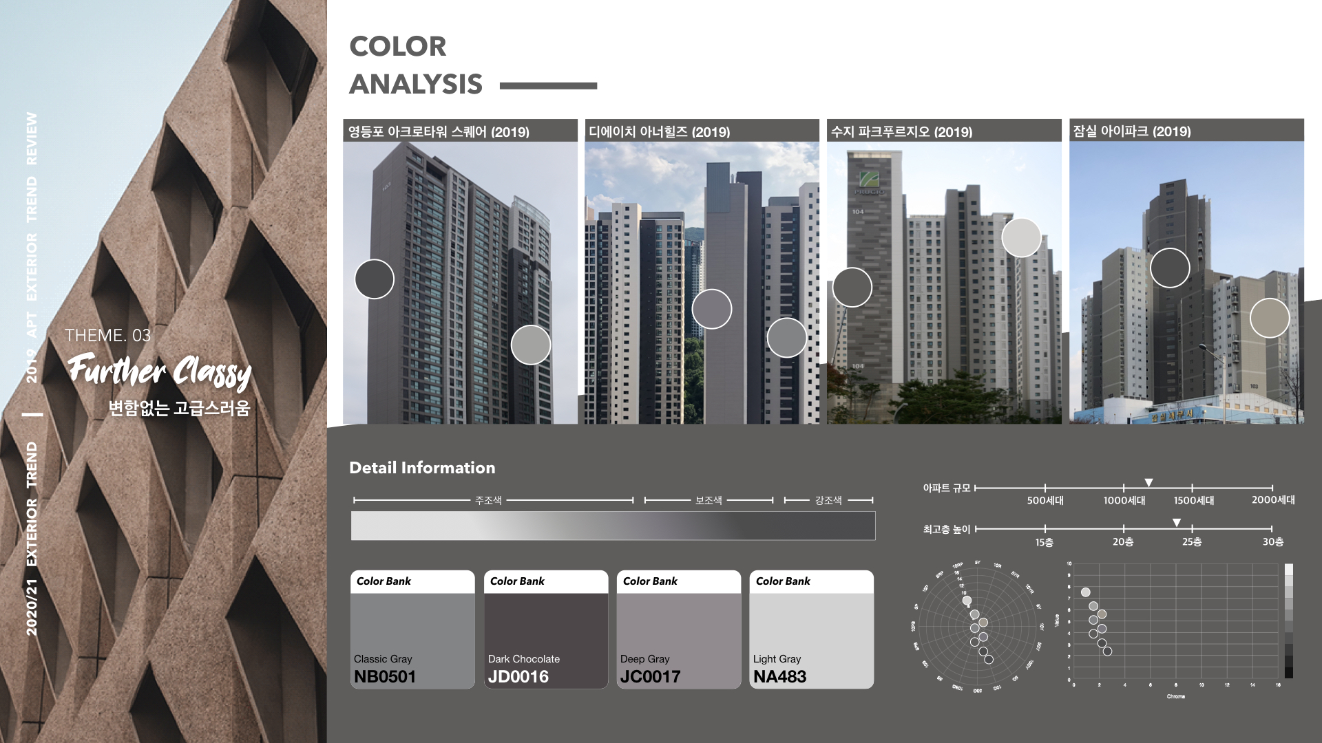전반적으로 웜톤의 컬러들로 구성되는 이 세 번째 테마는 눈에 띄는 강조색 없이 다양한 톤의 그레이 컬러 주-보조색을 레이어링 해서 사용한다. 세 번째 스타일은 다양한 규모의 단지에 두루두루 사용되어 평균적으로는 1000세대를 웃도는 중간 규모로 분석할 수 있다. 단지의 높이는 15층 정도의 저층부터 30층 이상의 고층까지 고급 주거를 지향하는 재건축 사례에 가장 많이 등장하고 있다.