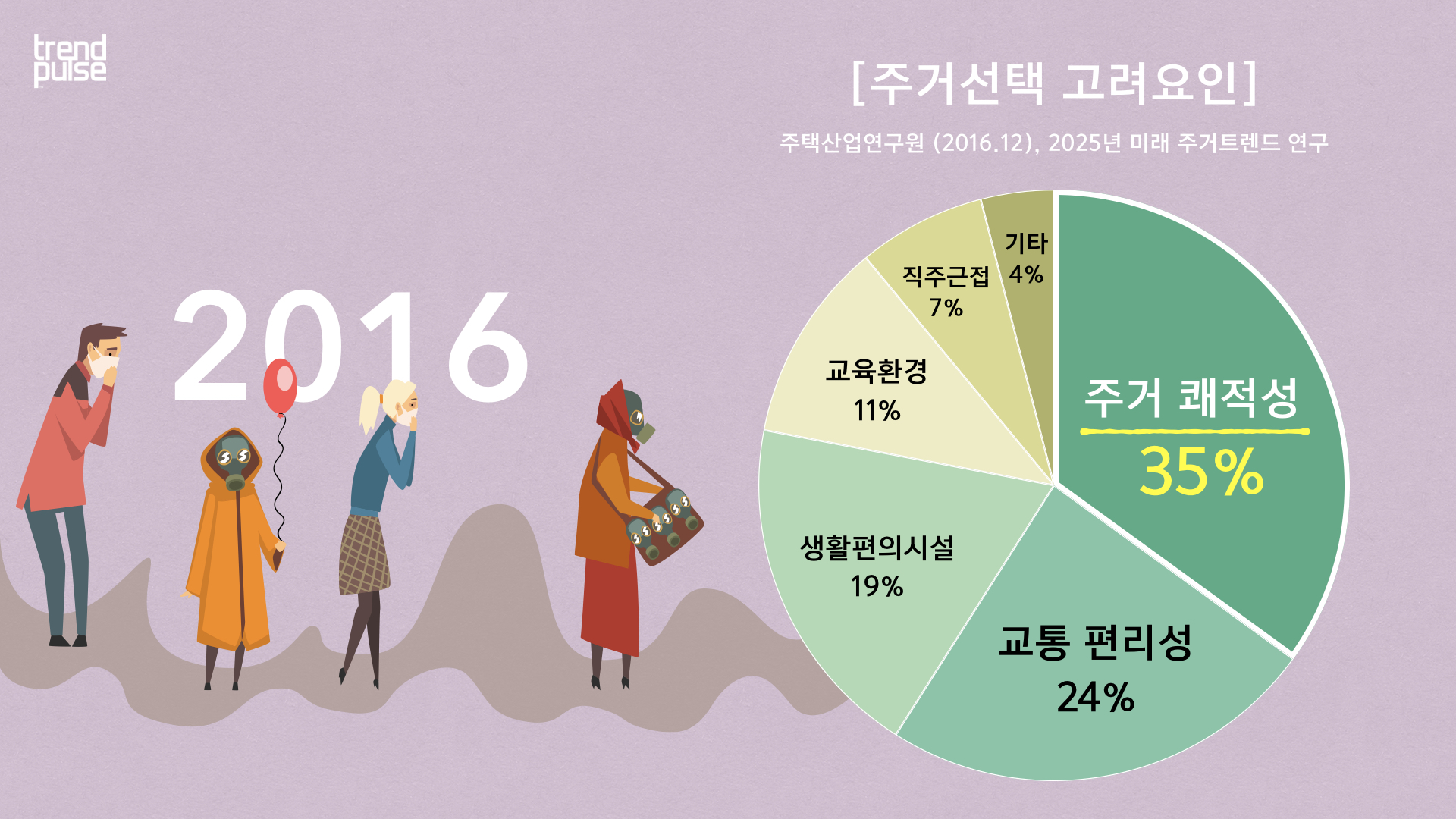 지난 2016년, 주택산업 연구원이 발표한 연구에 따르면, 응답자의 35프로가 주거 선택 시 가장 중요한 요인으로 ‘자연이 주는 쾌적성’을 택했다고 한다. 꾸준히 1위를 차지했던 교통 편리성을 제치고 ‘역대 최초’로 2016년에 1위가 바뀌게 된 것이다.