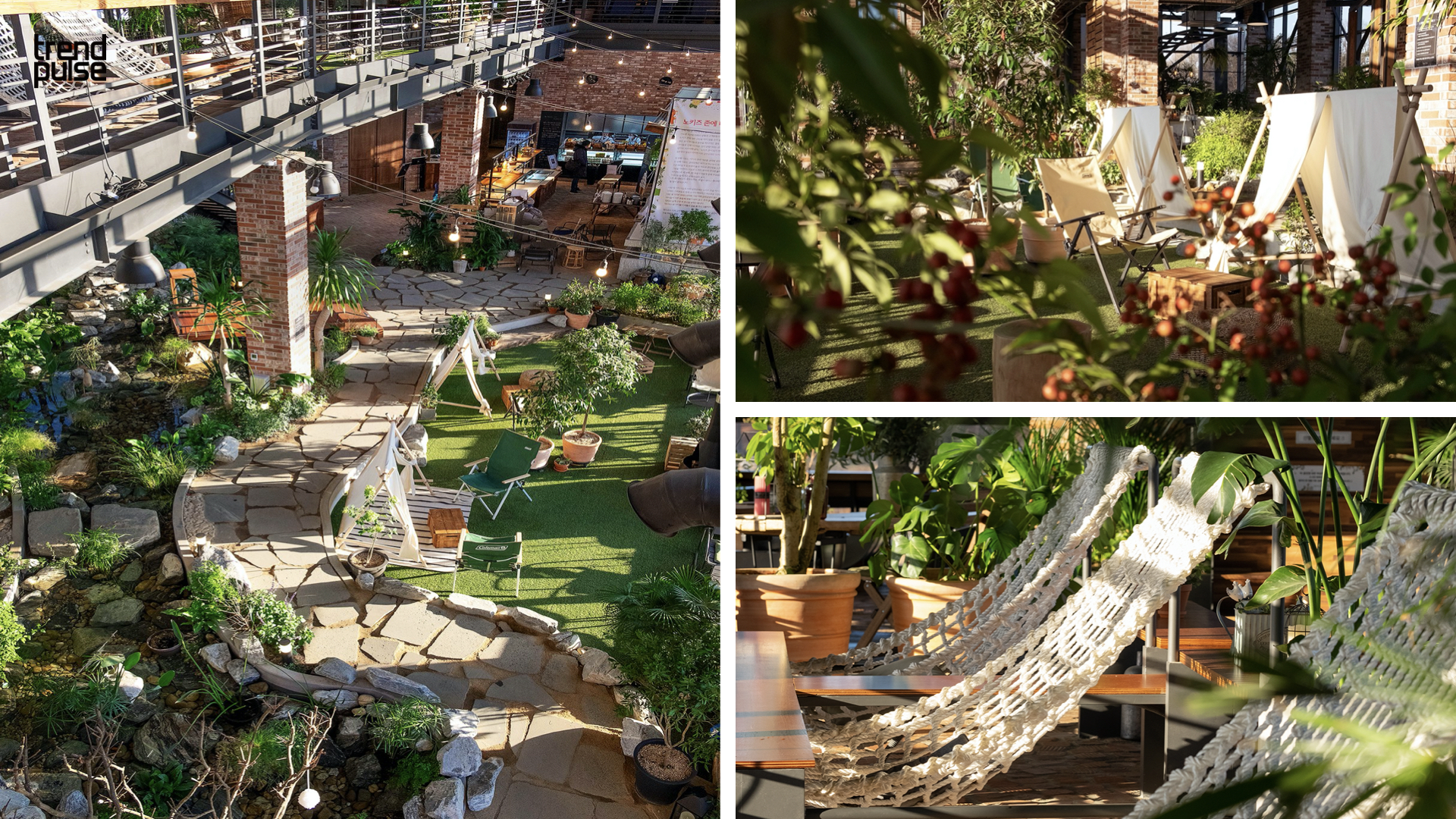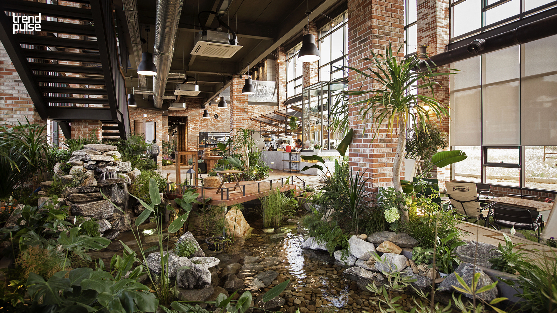 김포에 위치한 글린공원(Gleen Park)은 ‘사람이 안정과 여유를 찾을 수 있는 곳은 자연이기에 365일 공원과 같은 여유롭고 편안한 느낌을 주고싶다.’라는 취지로 실내 공원 형식의 카페를 조성하였다. 다양한 식재와 연못으로 이루어진 조경과 인도어 캠핑, 가든과 같은 요소를 통해 자연을 접할 때 얻는 힐링을 실내에서도 충분히 경험할 수 있도록 한다.