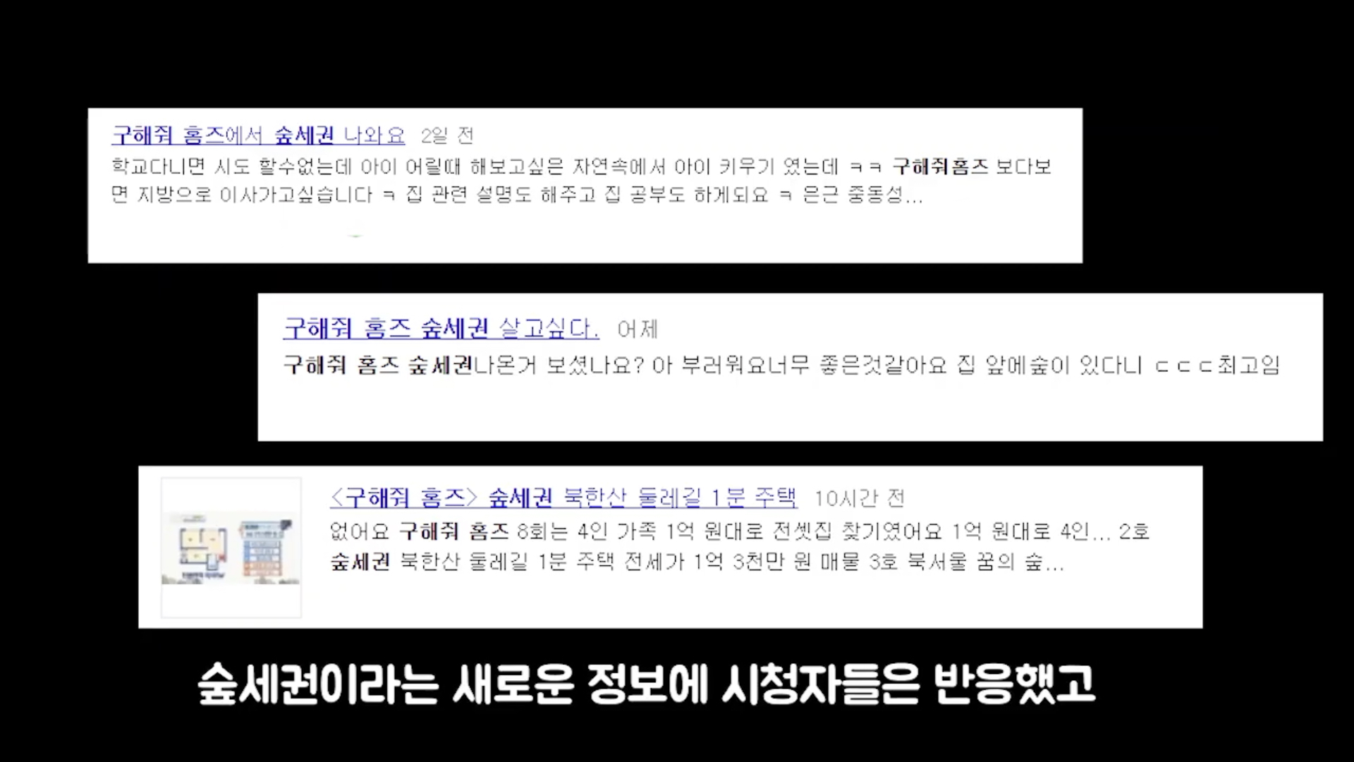 방송 이후 ‘숲세권’에 살고 싶다는 의견이 급증하며, 프로그램은 최고 시청률을 기록 할 만큼 큰 관심을 끌었다. ‘숲세권’이란 방송 아이템이 자연 가까이 살고자 하는 시청자들의 본성을 자극한 것이다.