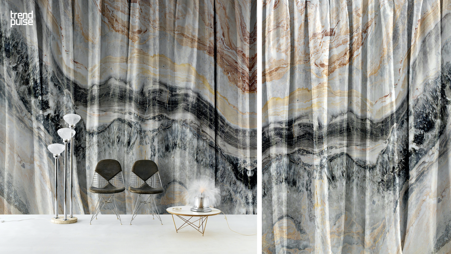 자연 그대로의 천연대리석을 커튼 모양으로 조각한 아트월. 실제로 시공한다면 작업 방법과 그에 따르는 비용이 상상을 초월할 것이다. 하지만 다행히도(?) 위의 이미지는 대리석 조각이 아니라, 사실 인키오스트로 비앙코(Inkiostro Bianco)라는 회사의 월커버링 컬렉션이다. 과거에 비해 프린팅 기술의 아웃풋이 실사와 비슷한 수준 높은 퀄리티를 갖게되면서 소비자들이 착각을 하게끔 만들 정도이다.
