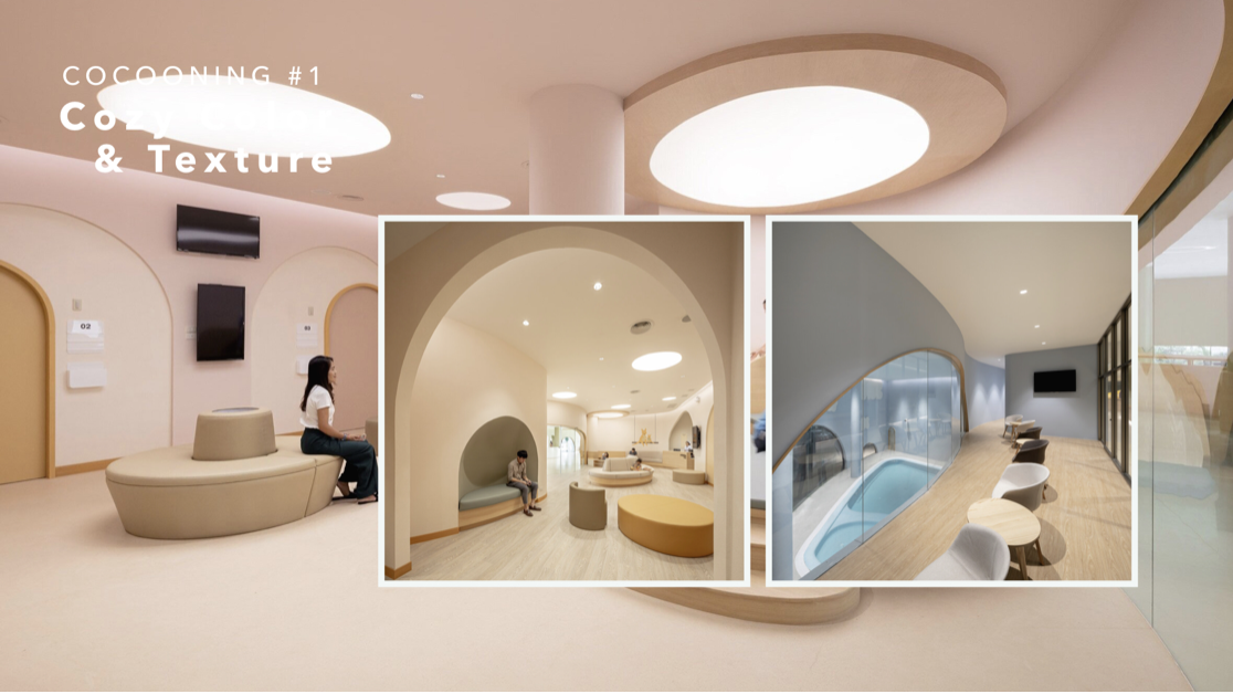 특히 공간에 적용된 패브릭 소재의 유선형 가구는 시각의 편안함 뿐만 아니라