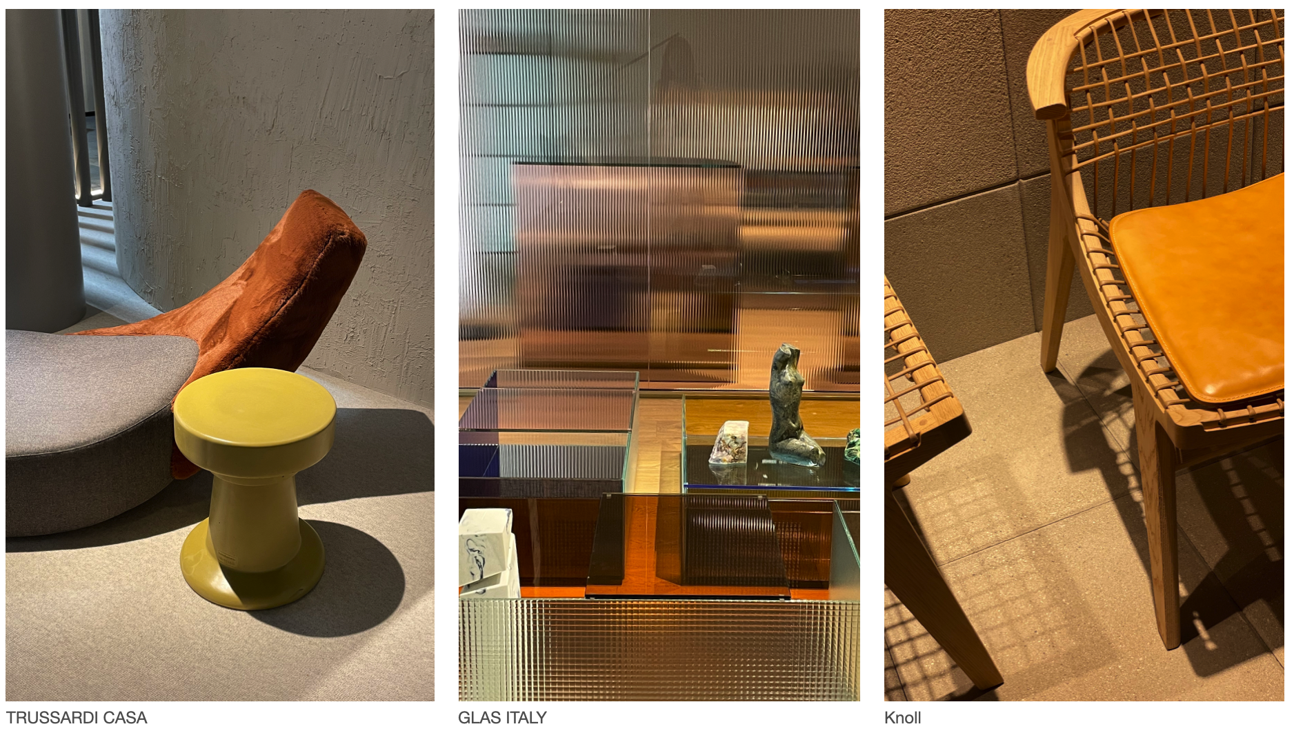 깊은 자연에서부터 비롯된 컬러와 빛과 유리를 활용한 입체감 있는 가구들은 이번 전시에서 주목할 부분이다. TRUSSARDI CASA는 밀라노 대도시의 역동성에서 영감을 받은 시대를 초월한 우아함을 전달하는 브랜드로, 레오나르도 탈라리코가 디자인한 하프문 디자인과 엘리사 오시노가 디자인한 안락의자을 뉴콜렉션으로 소개하였다. 자연의 안락함을 보여주고 Green, Orange Brown, Yellow 등의 원시적이고 깊은 톤의 컬러들로 보여진다. GLAS Italy는 1972년 설립된 전통있는 이탈리아 글라스 브랜드로 문, 벽, 파티션 등 유리로된 가구를 제조한다. 요한나 그로운더가 디자인한 디자인과 라미네이트 구성된 유리 제품들 그리고 넨도가 디자인한 레이어드 글라스 디자인 등을 선보이며 원색적이고 밀도감 있는 공간을 구성했다. 그리고 뉴욕 기반의 주거 및 사무용 가구 디자인 브랜드인 Knoll은 아이코닉한 제품들과 함께 안토니오 치테리오와 피에로 리소니와의 협업으로 현대성과 전통의 균형을 유지하는 컬렉션 공개했다. 가죽과 나무 본연의 브라운 컬러와 그린 컬러의 패브릭 스툴이 돋보였고, 부스는 모듈식 디자인을 적용하여 원초적이고 입체감 있는 제품들을 선보였다.