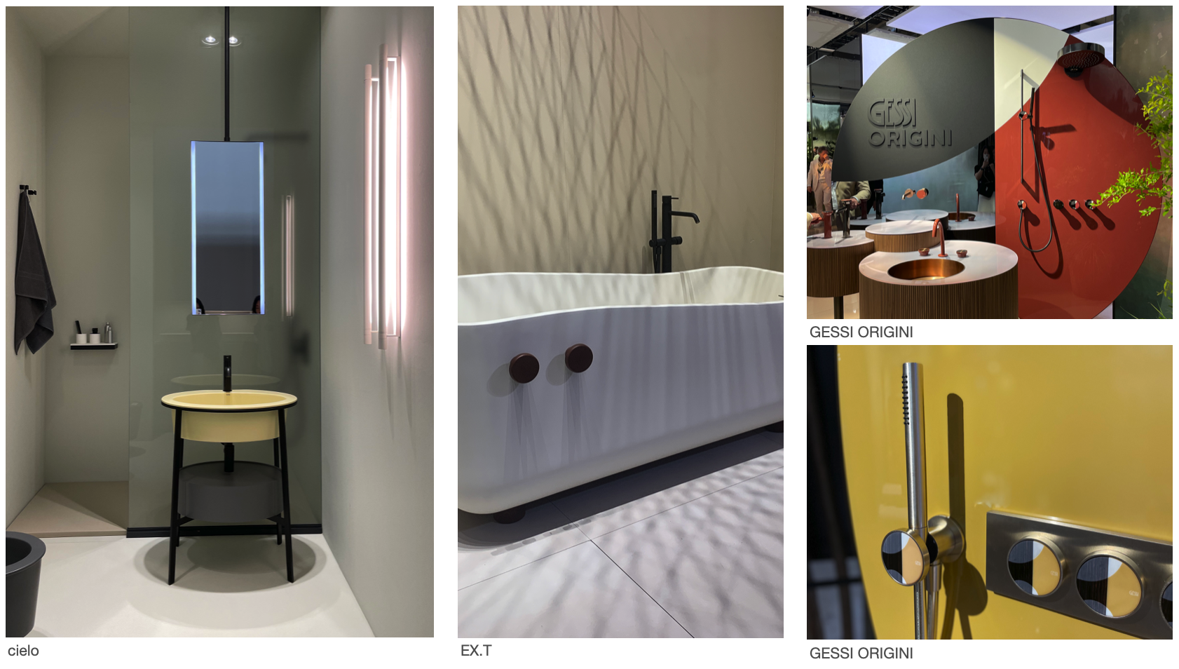 cielo는 이탈리아의 핸드메이드 제품으로, 컬러별로 존을 구성하여 컬러와 디자인에 따라 톤앤 매너가 다른 cielo만의 욕실 공간을 선보였다. 전통과 현대적인 해석이 가미된 Marcel 제품을 선보였고, 한정적인 욕실을 더욱 더 효율적으로 사용할 수 있도록 수납공간 디자인이 다채롭게 적용되면서도 심플한 디자인이 돋보인다. Ex.t는 인체공학적인 욕조와 더불어 제품의 디자인을 단순화하여 공간의 활용도를 높인 디자인들은 선보이는 등 심리스 디자인도 욕실 내에서 다채로운 형태로 보여지고 있다. 또한 프라이빗 웰니스 철학을 담은 이탈리아 욕실 주방 브랜드 GESSI ORIGINI는 25년의 역사를 바탕으로, 사적인 환경에서의 웰빙 문화를 창출하는 것에 초점을 맞추어 디자인을 해오고 있는데 이번 전시를 통해 형태는 심플하지만 포인트 될 수 있는 컬러를 활용하여 제품을 다채롭게 보여줬고, 수전의 경우 하나의 심플한 그래픽적 요소로서 표현되었다.
