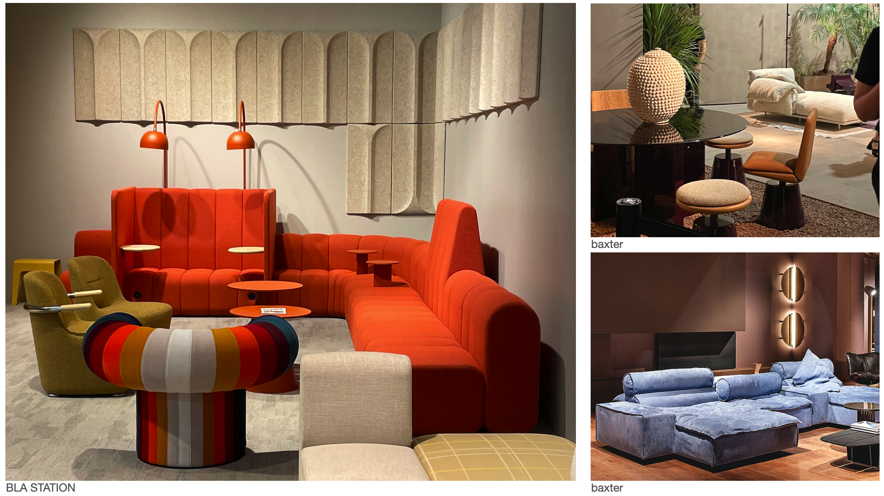 리빙 공간이 점차 미니멀하게 변화하면서 공간의 포인트로서 멕시멀한 가구와 오브제를 활용하는 모습들이 많이 보인다. 그 중에서 쇼파는 유기적이면서도 눈에 튀는 색채와 크기로 리빙 공간에서의 중심 오브제 역할을 하고, 서브 체어를 적절하게 활용하여 활기를 더한다. 건축학적인 설계로 구성된 소파와 의자를 주로 선보이는 스웨덴 브랜드 BLA STATION은 올해 원시적인 레드 컬러인 BOB 52 시리즈를 출시 하였고, 공간에서 다른 제품들과 여러 조합이 가능하도록 하면서도 공간의 포인트로서 존재감을 보여줬다. 느림과 편안함을 표현할 수 있는 패브릭, 나무 등의 소재를 활용한 제품들을 구성 하였고, 사람들이 자유롭게 소재를 만지고 쉴 수 있도록 전시를 구성했다. baxter는 돋보이는 소재와 컬러를 활용하여 침실, 거실 등 공간의 무드를 구분하여 표현했고, 전통 소재, 자연의 컬러들로 공간의 볼륨감을 살렸다.
