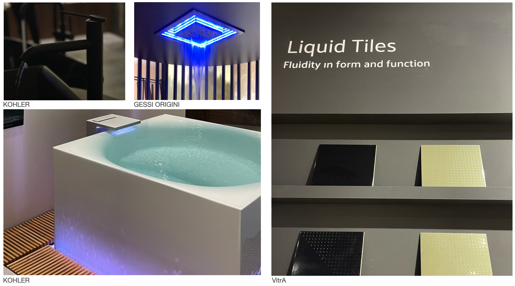 미국 프리미엄 욕실브랜드 KOHLER는 신제품 블랙 반광의 Branzn 욕실 콜렉션과 스테이트먼트 샤워 컬렉션 그리고 빛, 아로마, 안개 등을 활용해 욕실에서의 테라피적 요소를 보여주는 고요한 목욕 제품을 선보였다. 수전, 도기, 양변기 등 전체적으로 깔끔하고 모던한 디자인을 선보였고 몸과 마음을 진정시킬 수 있는 욕실에 꼭 필요한 요소들만을 선보인 것이 특징이다. GESSI ORIGINI는 라이트의 컬러를 활용하여 그날의 컨디션에 따라 소비자가 원하는 라이트를 욕실에서 사용할 수 있는 제품을 선보였고, 터키 브랜드 VitrA는 영국 디자이너 Tom Dixon와 협업하여 Liquid 컬렉션 타일은 물결 모양을 연상시키는 엠보싱 벽 타일 라인이다. 편안함을 향상시키고 감각적인 디테일과 차분한 컬러가 특징이다.