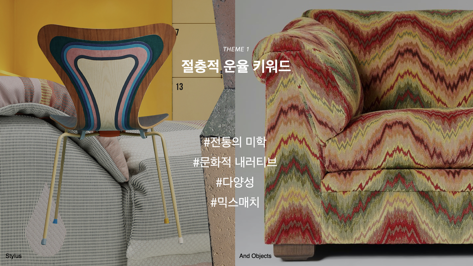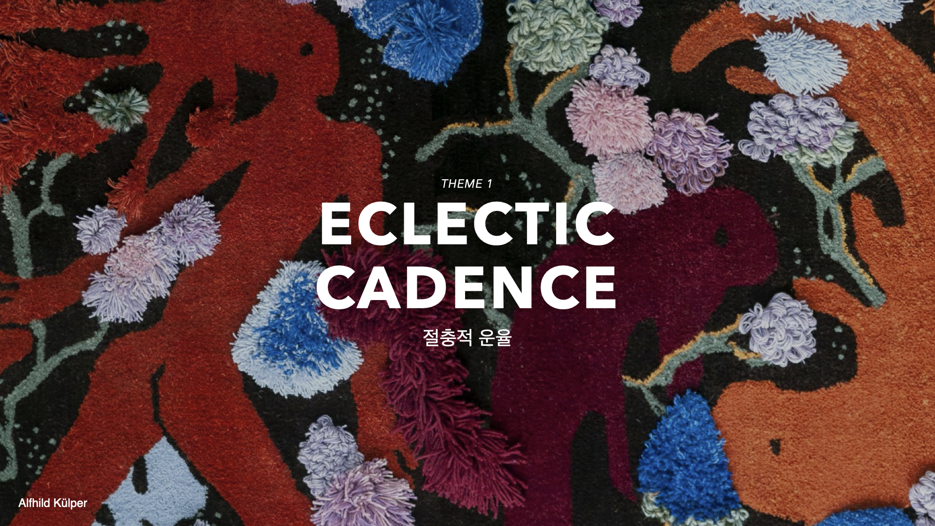 이렇듯 각자가 일궈낸 공예의 진중함과 민족적 컬러감 및 패턴들이 소재로 완성되면서 전통 헤리티지 디자인이 주를 이루게 될 것으로 예측되며, 집약적 전통 계승을 주요한 가치로 여기는 풍토가 이어질 것으로 전망한다. 따라서 테마 1 'Eclectic Cadence(절충적 운율)'에 주목할 키워드는 #전통의미학 #문화적내러티브 #다양성 #믹스매치로 정리된다.