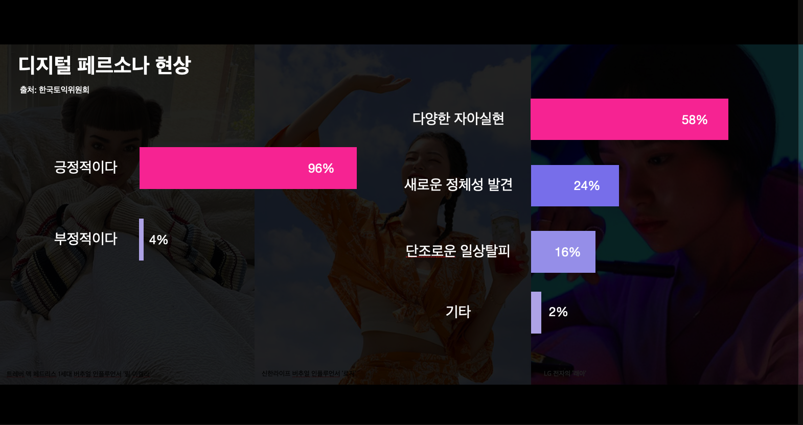 메타버스, 가상현실 등 현실을 디지털 영역으로 확장시키는 콘텐츠들은 지난 해부터 큰 관심과 주목을 받고 있는 콘텐츠로 꼽힌다. 현실의 제약에서 벗어나 자유로운 공간에서 각자의 카타르시스를 느끼게 된 사람들은, 디지털 세계 속 황홀감 속에서 살아가고 있다. 이러한 현상은 MZ세대를 중심으로 더 극대화되고 있고, 새로운 형태의 도피성이 하나의 유희적인 요소로 자리잡게 되었다.