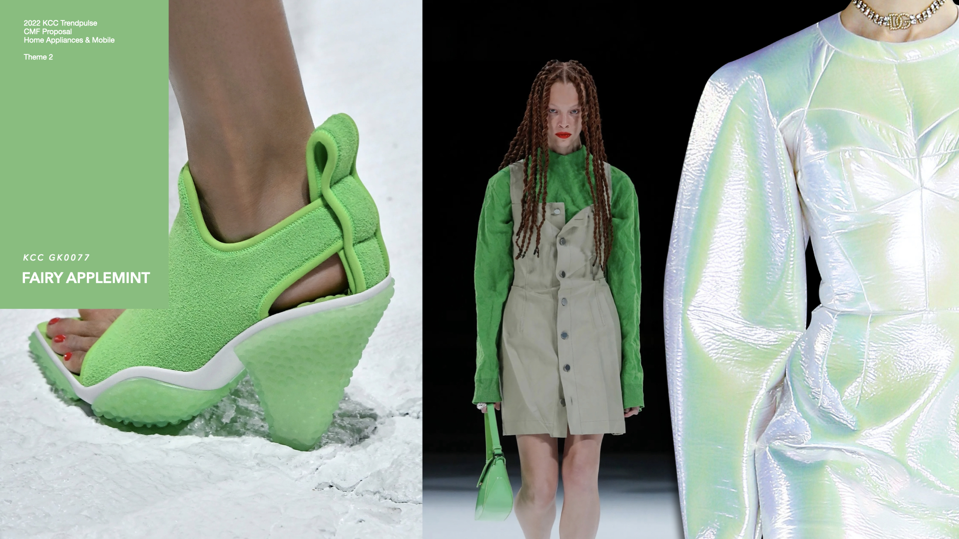 Fairy Applemint(페어리 애플민트)는 향수를 뿌린듯한 인공의 향이 감도는 애플민트 그린은 유머러스하고 톡톡튀는 컬러로, 굴절에 의해 빛이 반사되면서 보여지는 스펙트럼 속에서 보여진다. 가상세계 속 오브제가 현실의 진화된 감성을 보유하고 있음을 부드러운 네온 컬러로서 보여준다. 2022년 SS 런웨이에서도 그 존재감을 자랑하는 컬러로 보여지며, 빛의 투명함과 채도 높은 컬러의 조합이 새로운 황홀감을 선사한다.