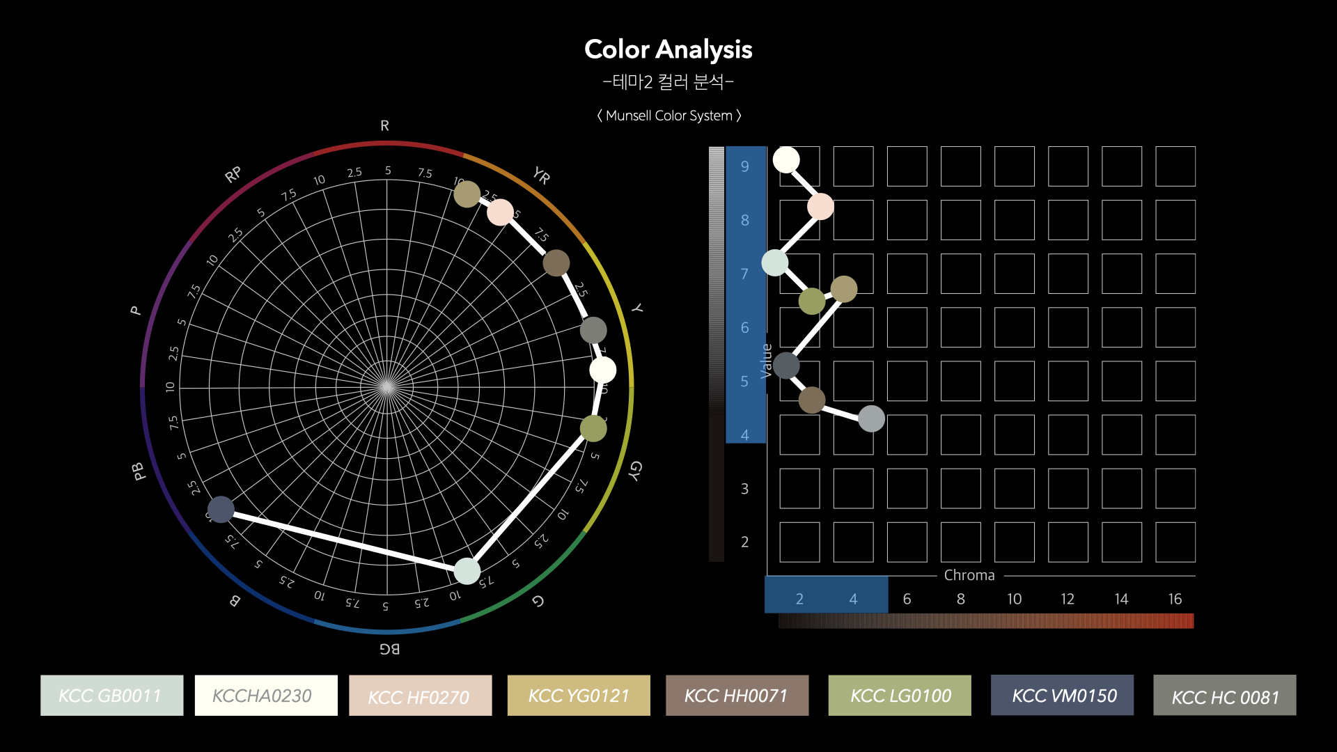 테마2에서 제안된 컬러들의 속성을 분석해보면, 주 색상은 자연소재에서 오는 편안함을 극대화시킨 옐로우, 그린 계열에 분포하고 있고 다크 아쿠아는 유일한 퍼플 블루컬러로 다른 컬러들과 보색대비를 이루며 단조로울 수 있는 배색에서 포인트컬러로 작용한다. 명도(Value)의 경우에는 4부터9 사이를비교적 비슷한 간격으로 분포 해 있고 채도(Chroma)는 주로 저채도로 분포되어있어 시각적인 안정감을 선사한다.