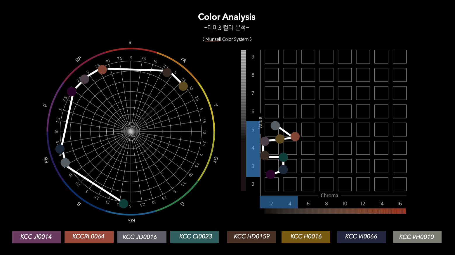 테마3에서 제안된 컬러들의 속성을 분석해보면 옐로우와 그린을 제외한 나머지의 색상이 모두 포함됨으로 하이브랜드 컬러의 고정관념을 깬 스팩트럼을 보여주고 있다. 하지만 명도(Value)의 경우에는 3부터 5사이에 비교적 낮은 명도를 차지하고 채도(Chroma)는 매우 저채도를 띄며 클래식한 분위기는 유지되는 것을 확인 할 수 있었다.