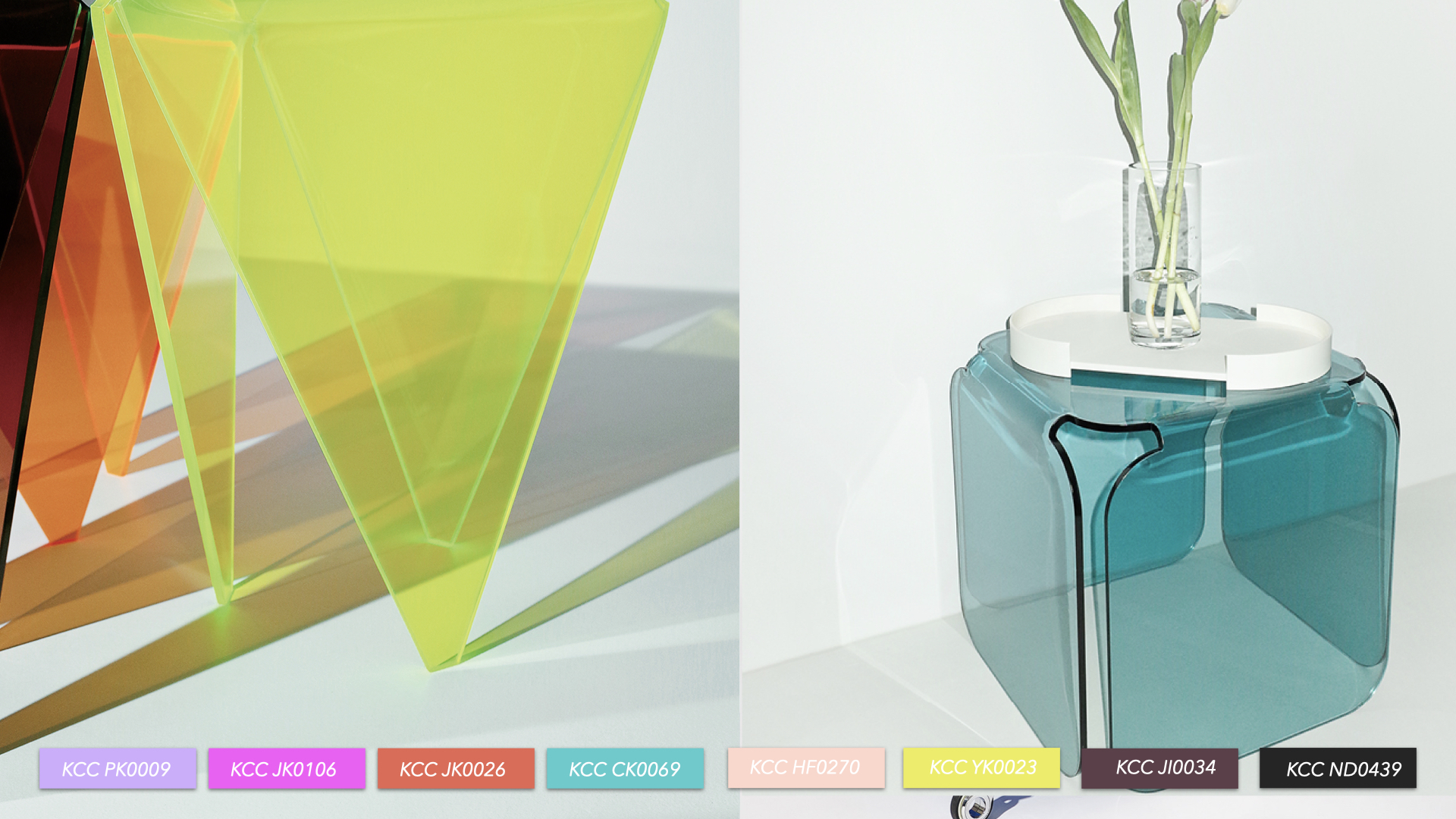 뿐만 아니라 최근 상업공간 뿐 아니라 주거공간에서도 공간의 성격을 벗어난 인테리어 스타일이 인기를 끌고 있다. 특히, 이번 해 아크릴 소재의 변신을 통한 다양한 컬러 구현에 주목 해 볼 만하다. 가구 브랜드 '앱톤'은 최근 아크릴 소재의 이리데센트 컬러 표현이 두드러진 홈퍼니쳐를 신제품으로 출시했다. 욕실 브랜드 Lafuen 또한 욕실 공간의 다양성을 높이기 위해 아크릴 기반의 소재를 이용한 디바이더나 슬라이더로 그 효과를 극대화 시키는 추세다.