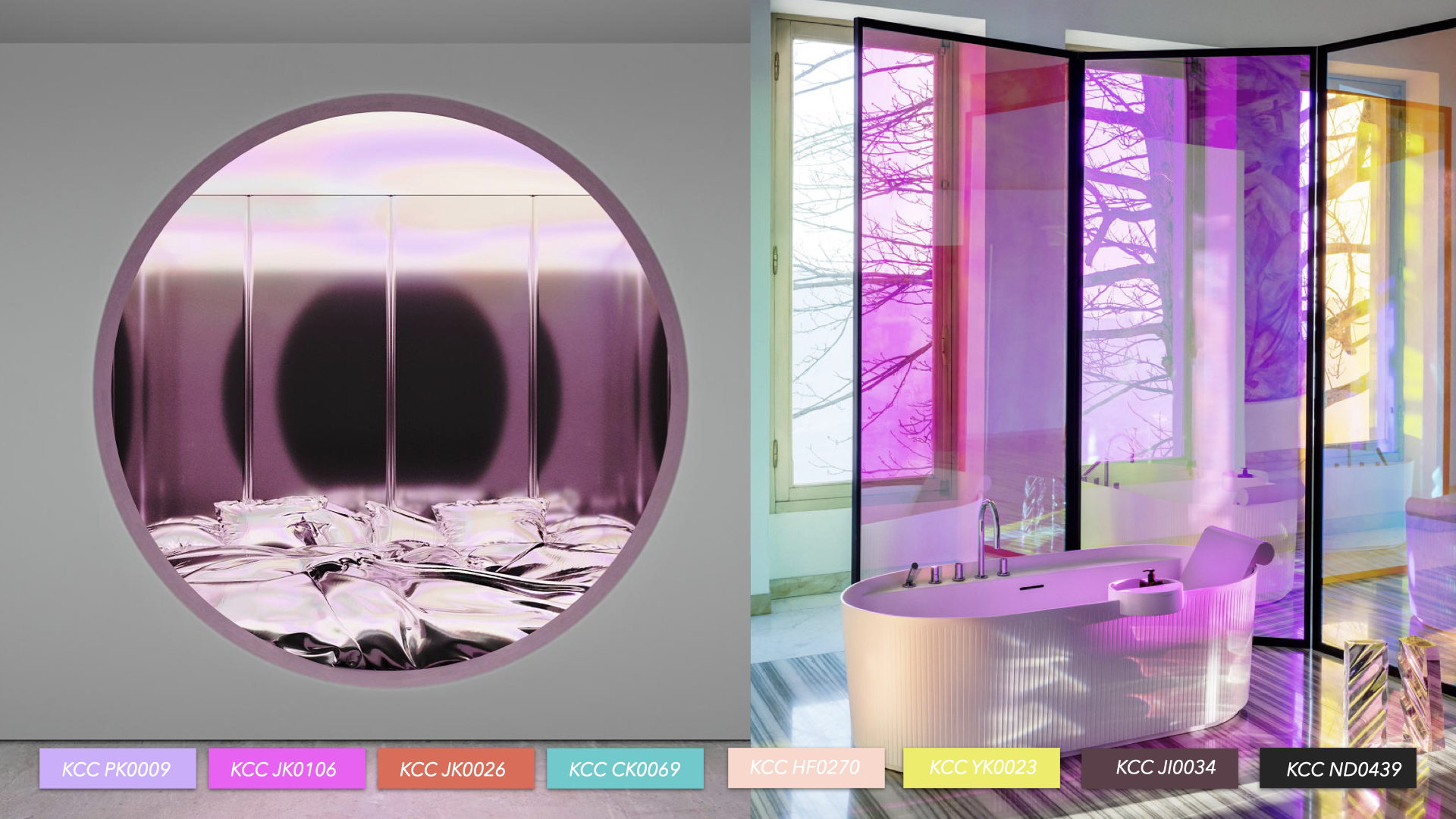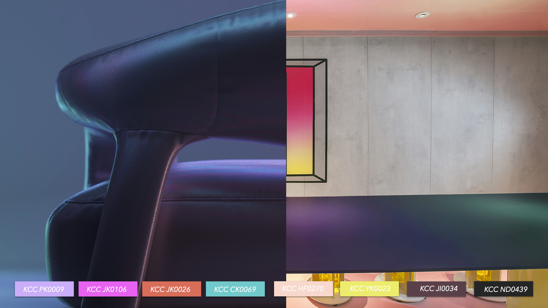2022 KCC Trendpulse 인테리어 첫번째 테마, 연결적 전환 'Transitional Conenct'에서 소개 할 팔레트는 멀티 페르소나적 성향 그리고가상공간의 전환 시대로 들어서며 주목받게 될 다중적이고 실재감있는 인스퍼레이션에 집중한 컬러이다. 색과 관련된 감각적 판단을 보다 객관적으로 전개하기 위하여 KCC에서는 IRI 형용사 이미지 스케일 분석을 통해 오차없는 컬러 예측을 시도하고 있다.