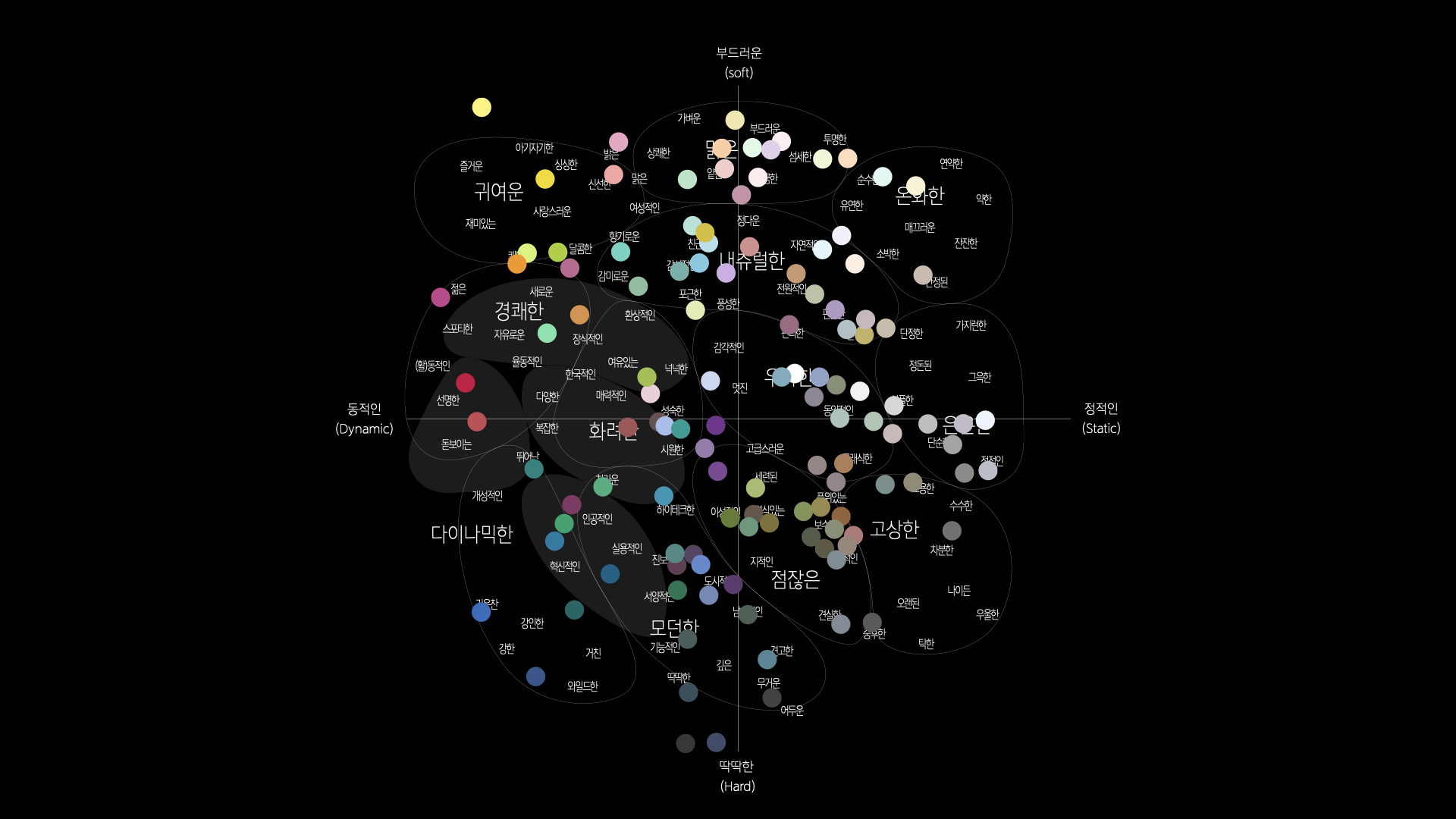 위 자료에 따르면 첫번째 테마, 연결적 전환 'Transitional Conenct'에서 보이는 공간적 특성이 다이나믹한, 활동적인, 하이테크한 등과 연결되는것을 확인 할 수 있고 색채의 이미지를 통계적으로 요인분석법을 통해 정리한 이미지 스케일상에서 다음과 같은 컬러들이 속해있는것을 알 수 있다. 이 중 여덟까지 컬러들을 엄선 해 2022년 인테리어 첫번째 테마의 컬러 팔레트를 구성했다.