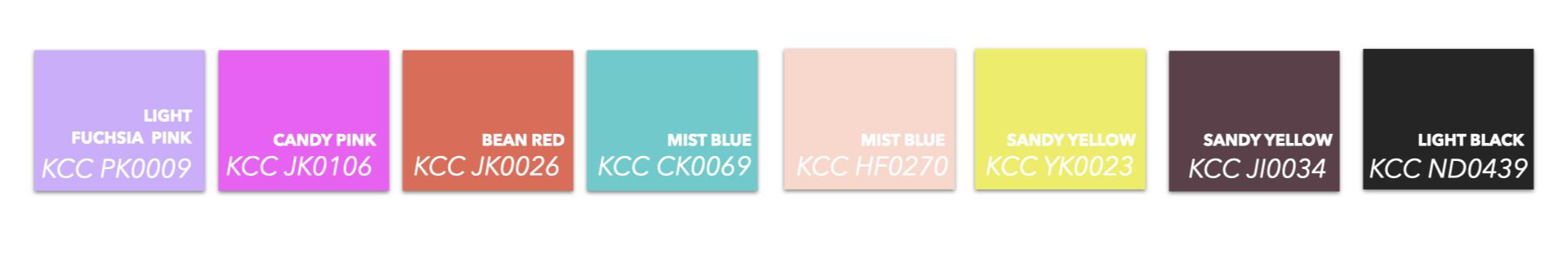 이 컬러들의 속성을 자세히 분석 해 보면 다양한 페르소나적 컬러들을 기반으로 퍼플부터 레드 옐로우, 블루까지 넓은 스팩트럼으로 분포하고 있고 그 중에서도 퍼플 레드 계열이 많은 비율을 차지하고 미스트 블루,Mist Blue 의 경우 유일한 블루 계열로 배색에서 포인트 컬러로 작용한다. 명도의 경우 비교적 낮은 값으로 밝은 계열의 컬러들을 띄고 있고 채도의 경우 중,저채도에 위치 해 있어 서로 섞였을때 이질감이 없다.