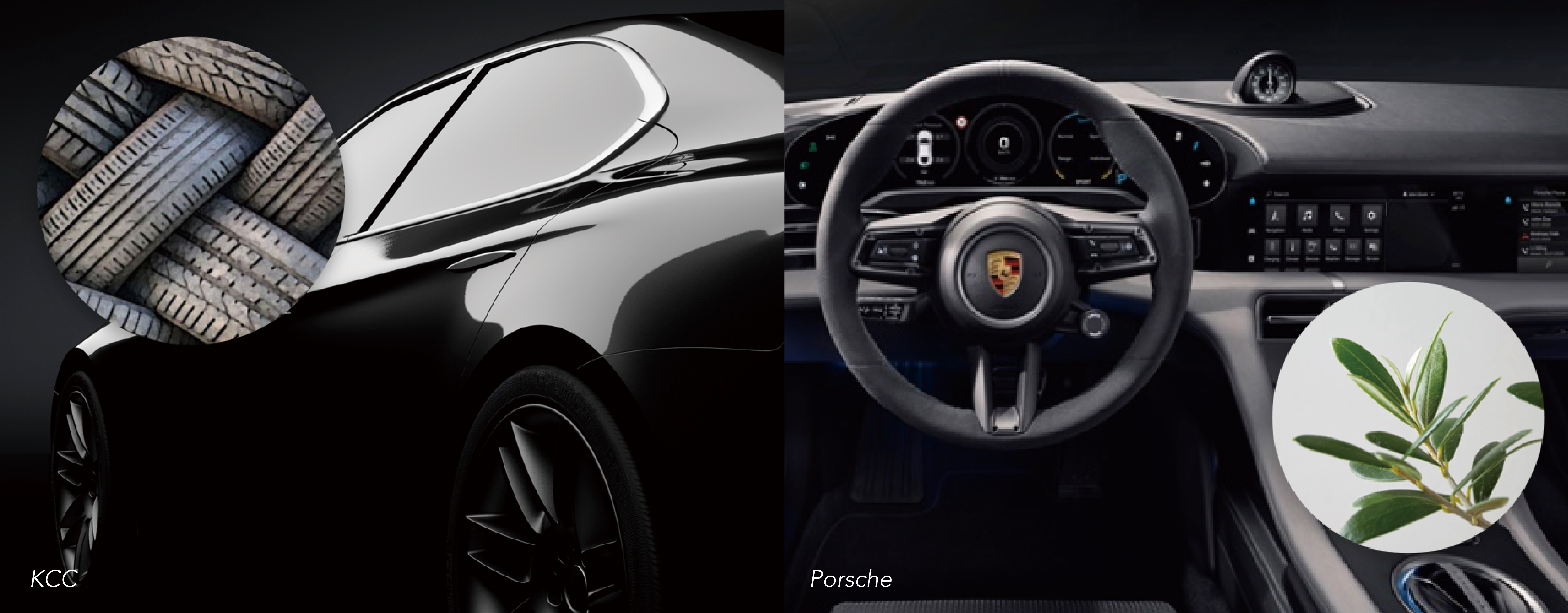 글로벌 모빌리티 기업 포르쉐는 올리브 잎으로 만든 올리 가죽을 사용해 인테리어 소재로 활용하기도 하고, 전혀 가죽을 사용하지 않는 ‘레이스-텍스’ 인테리어 디자인을 선보이기도 하였다.