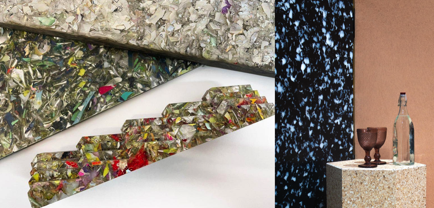 Emily Hatton(에밀리 해튼)과 Revive Innovations(리바이브 이노베이션)은 협업을 통해 재활용 CD를 활용한 3D Dèco 타일을 건축물에 사용할 수 있도록 제작했는데, 금속에서 보여지는 반짝이는 빛은 새로운 느낌의 효과를 내어 새로움을 준다. Smile Plastics(스마일 플라스틱)은 도마와 플라스틱 포장재로 만든 대리석 느낌의 소재를 제작하기도 하는데, 이처럼 재활용된 소재들에서 보여지는 컬러와 패턴들은 비정형적인 것들로 구성되는 특징이 있어 매력적인 소재로 활용되고 있다.